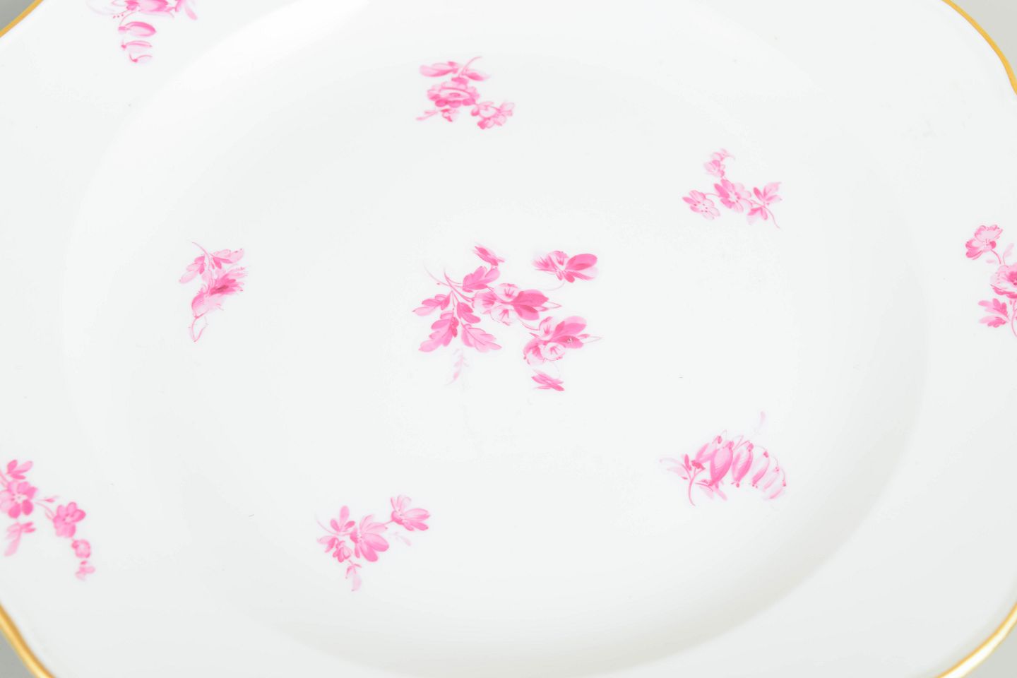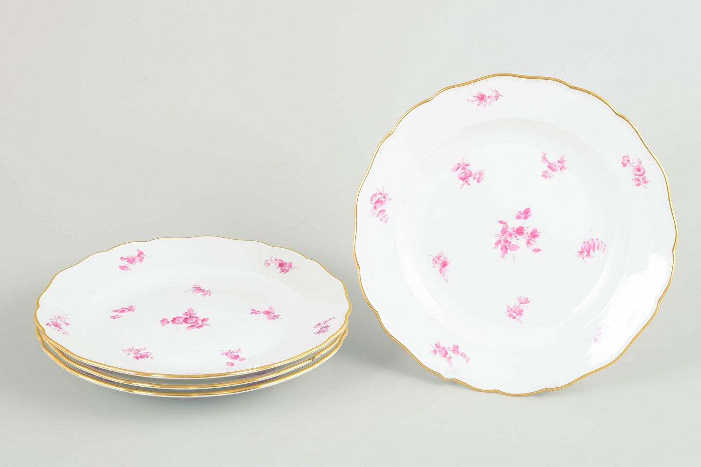 Porcelænstallerkener med let bølget fane, forgyldt kant og håndmalet dekoration i rosa blomster. Klassisk Meissen-udtryk fra perioden omkring år 1900.