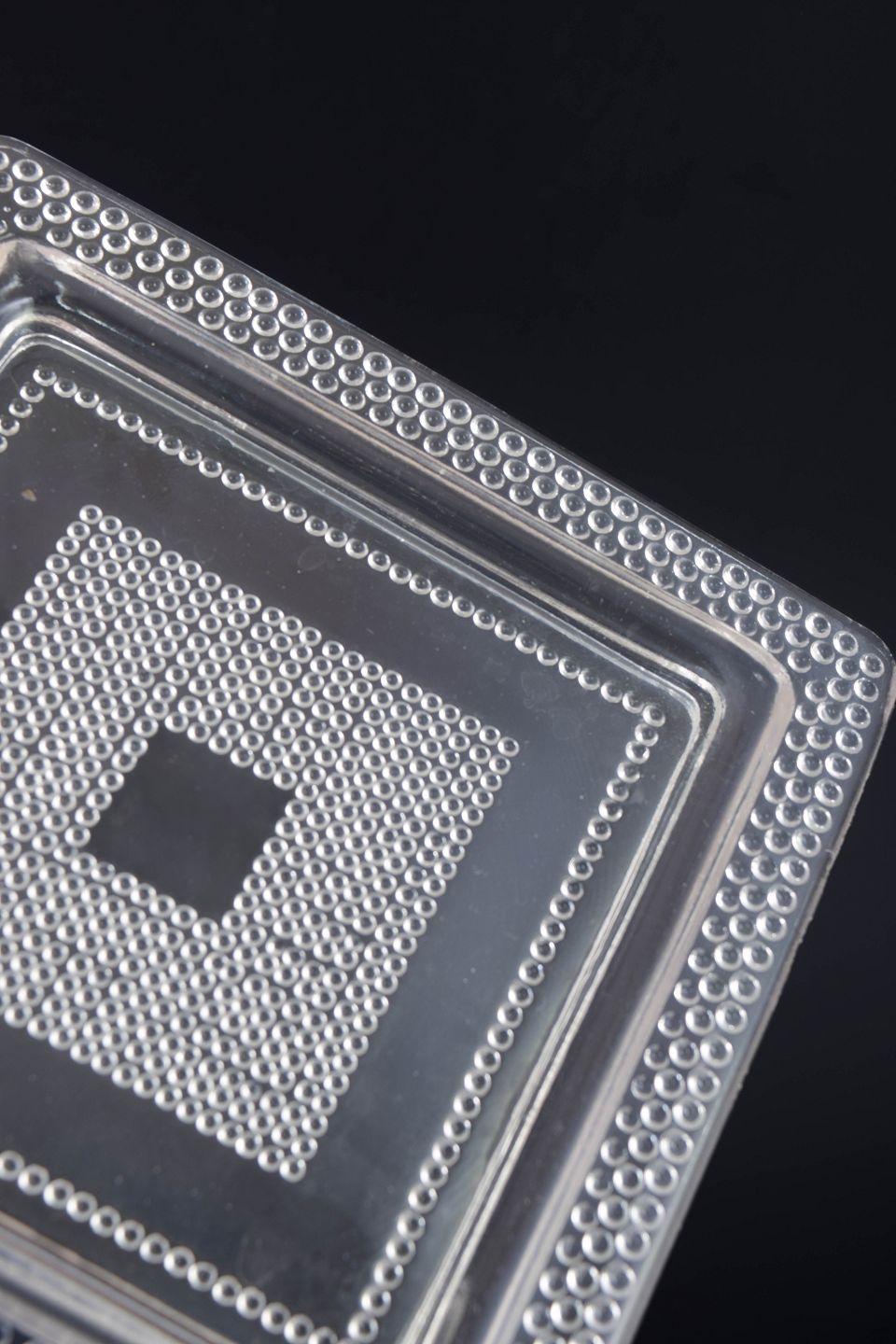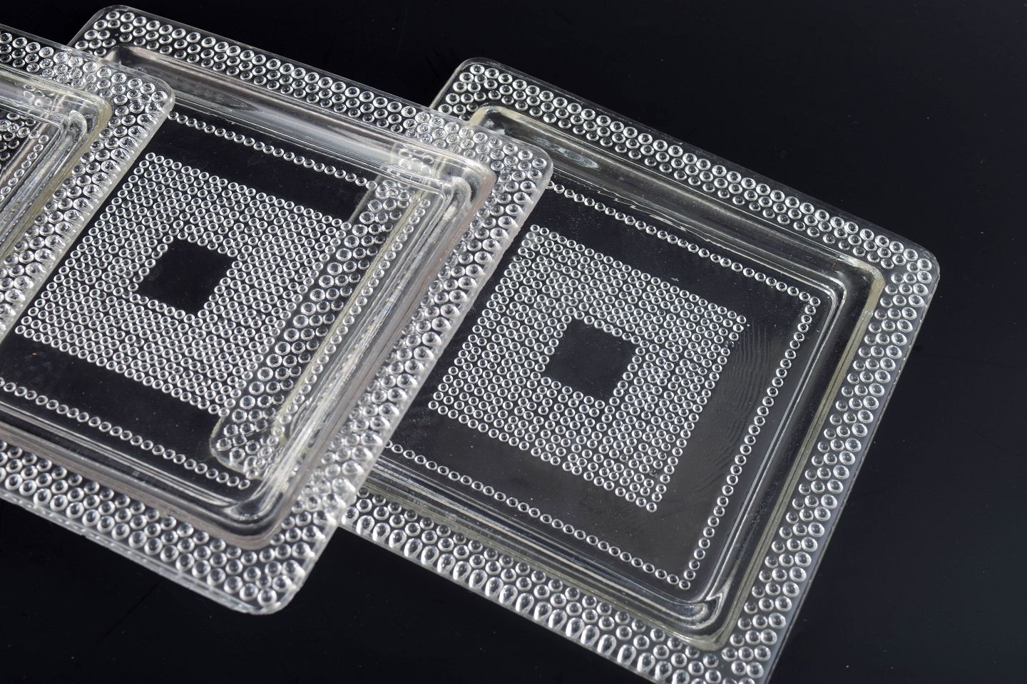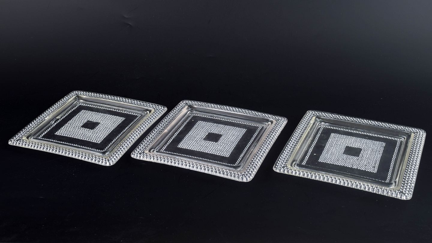 Sæt på tre kvadratiske tallerkener i klart kunstglas med geometrisk relief og markeret midterfelt. Fremstillet i presset glas.