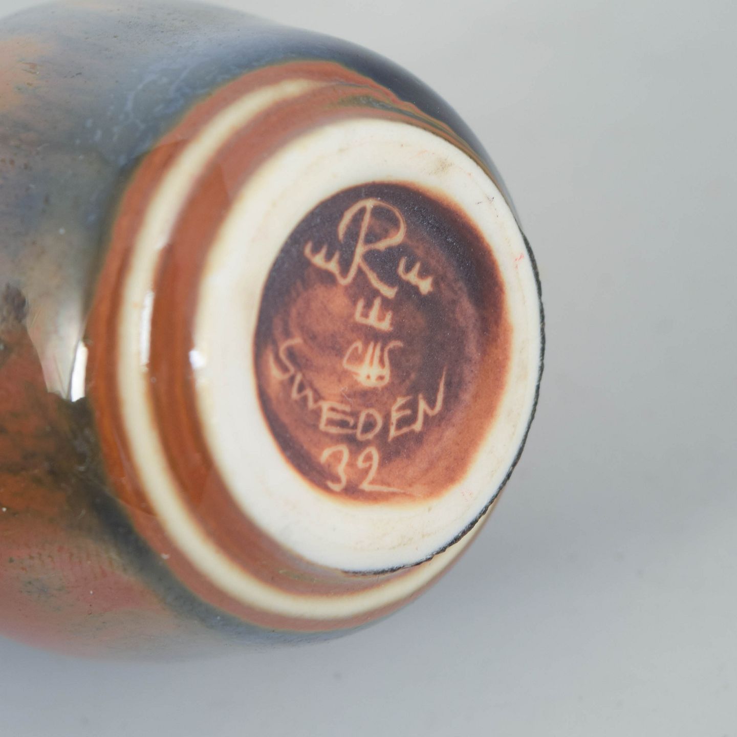 Miniaturevase i stentøj med blank glasur i dybe blågrå og varme brunlige toner, balusterformet krop og smal hals. Undersiden stemplet Rörstrand, Sweden.