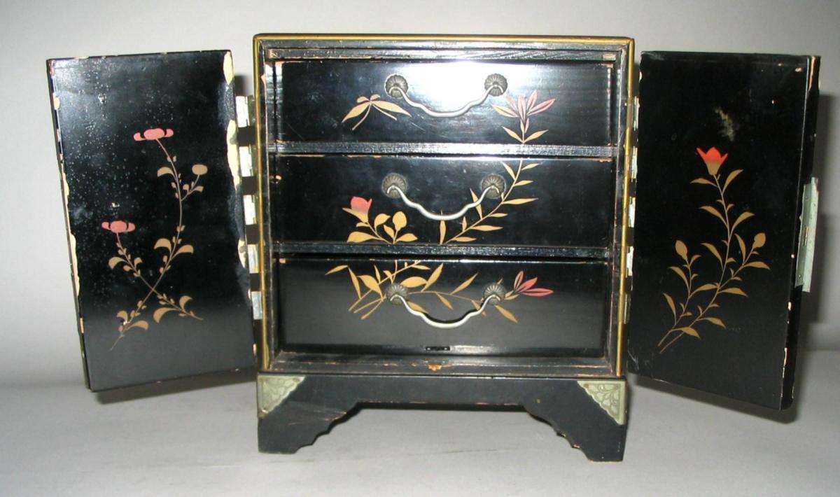 Kinesisk smykkeskrin i lakarbejde med dekorationer i form af fugle på grene med bær. Med to låger; indvendig med tre skuffer - ligeledes med dekorationer. H.: 21 cm. D: 11 cm. B.: 19 cm. Med enkelte afskalninger.
