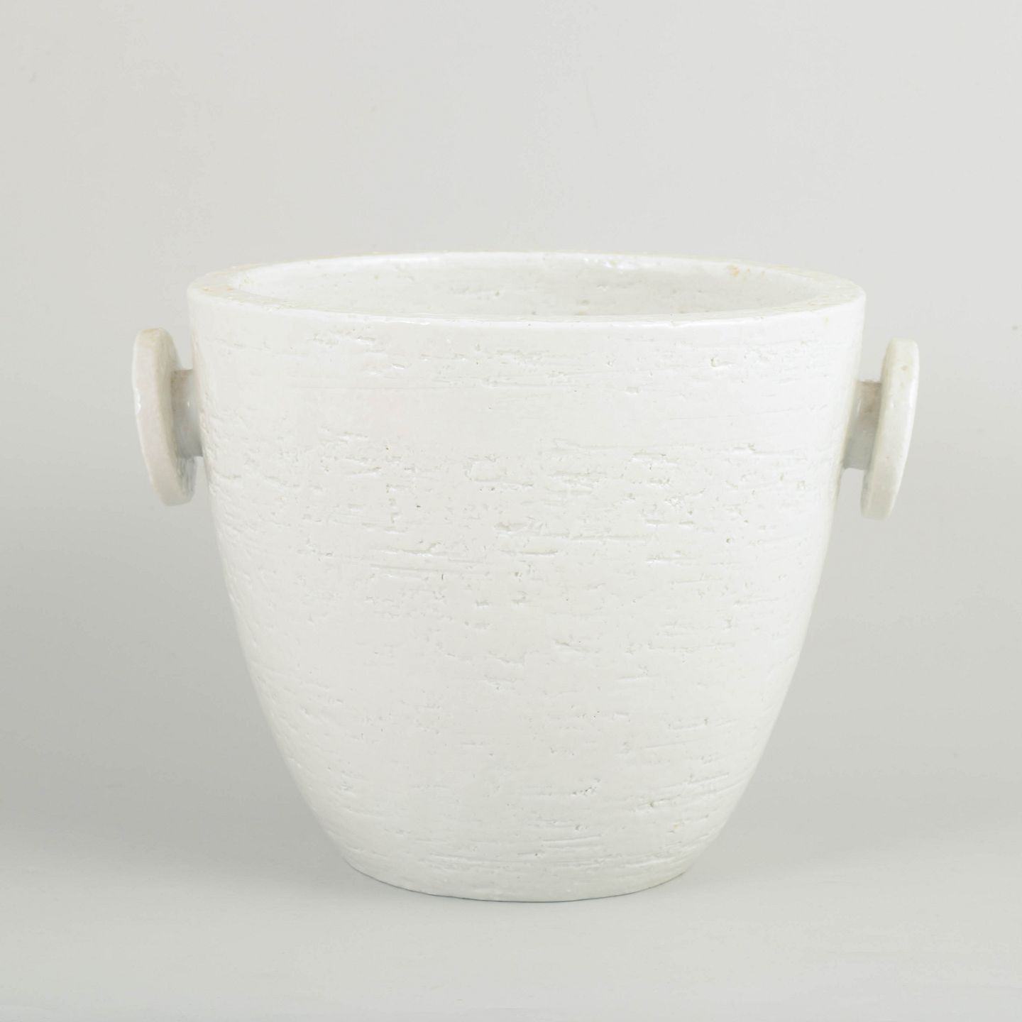 Stor cylindrisk champagnekøler/isspand i hvidglaseret stentøj med let konisk korpus og to markante sidehanke. Overfladen fremstår med diskret struktur og mat hvid glasur. Stemplet i bunden.