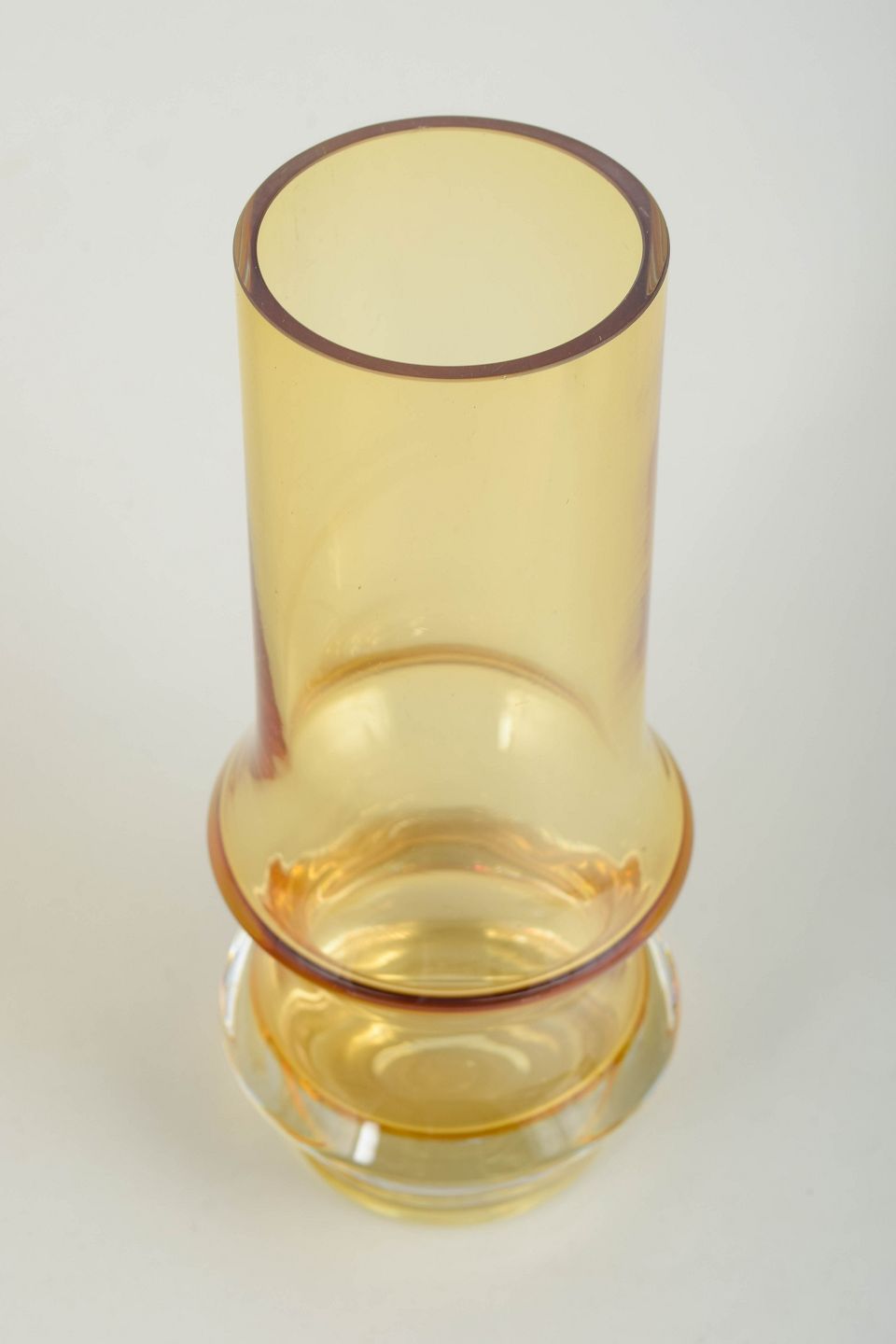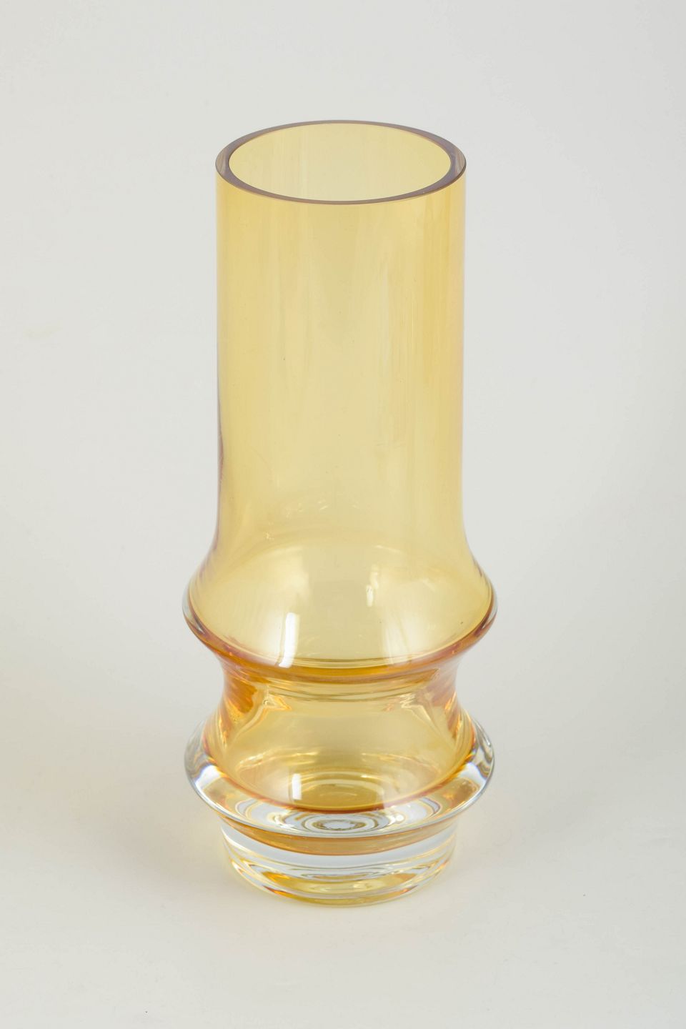 Høj cylindrisk vase i ravfarvet kunstglas med let udadbøjet munding og markant profileret fod. Udført i mundblæst glas med varm gylden tone og klar, massiv sokkel. Usigneret.