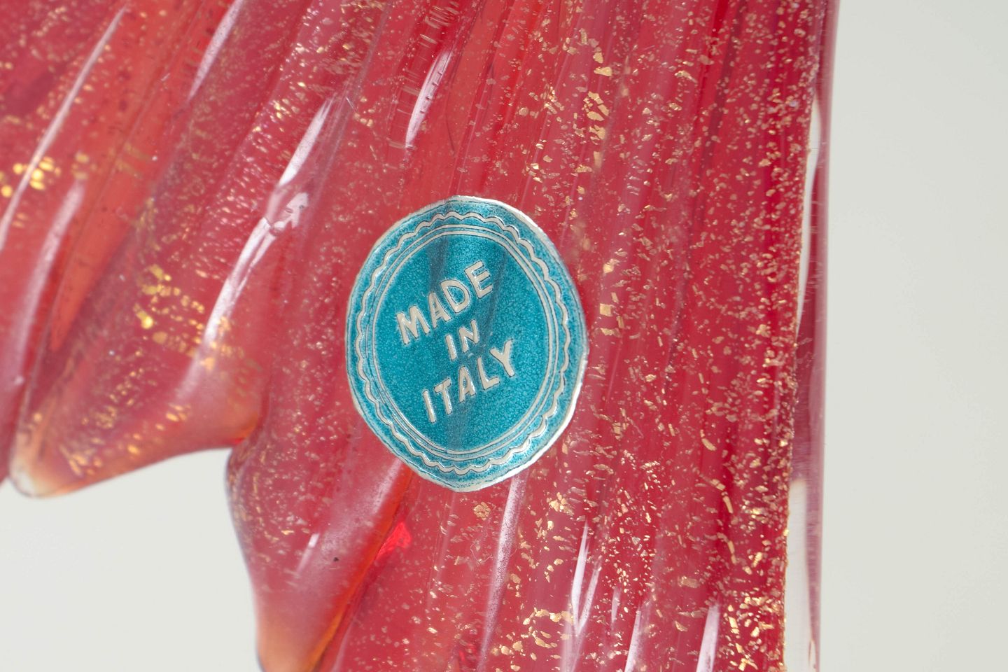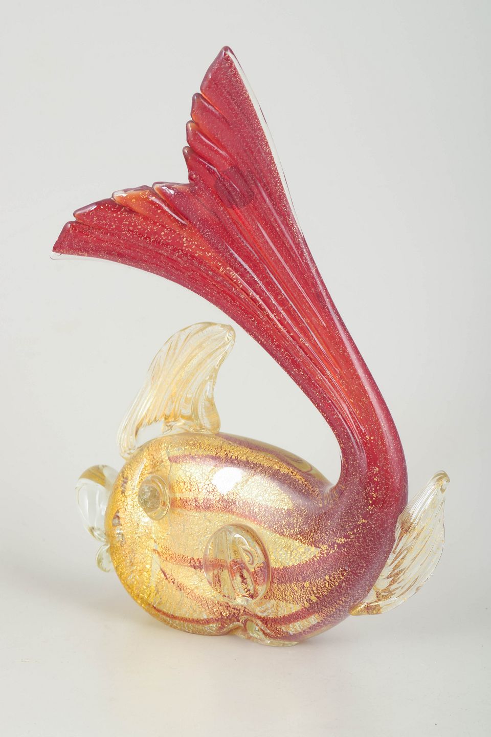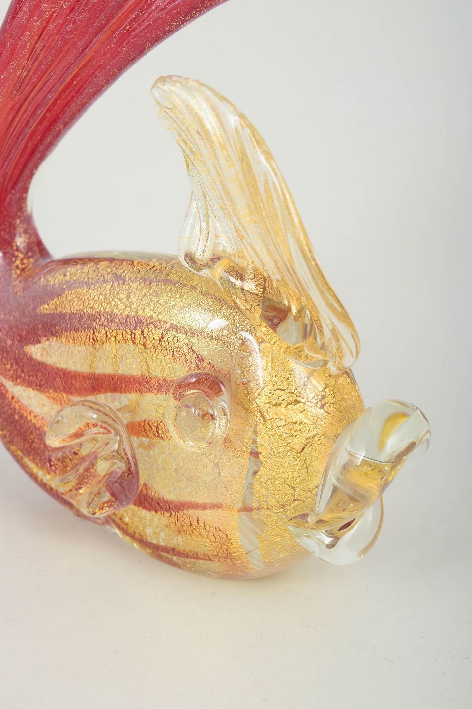 Decorative hand-blown glass sculpture in golden and pink tones with internal gold inclusions. Organically shaped fish with a dramatically curved tail and clear applied details. With original Murano sticker.