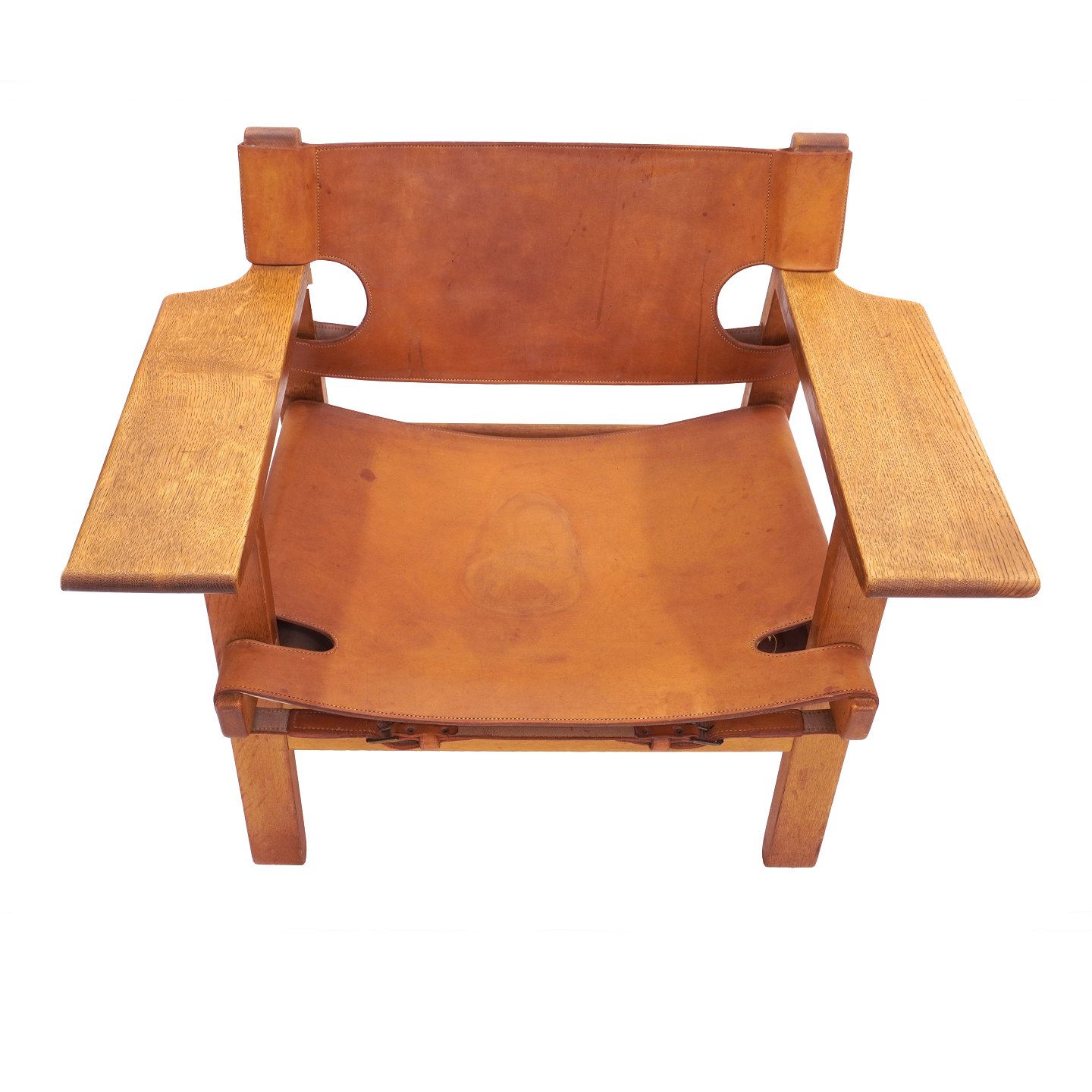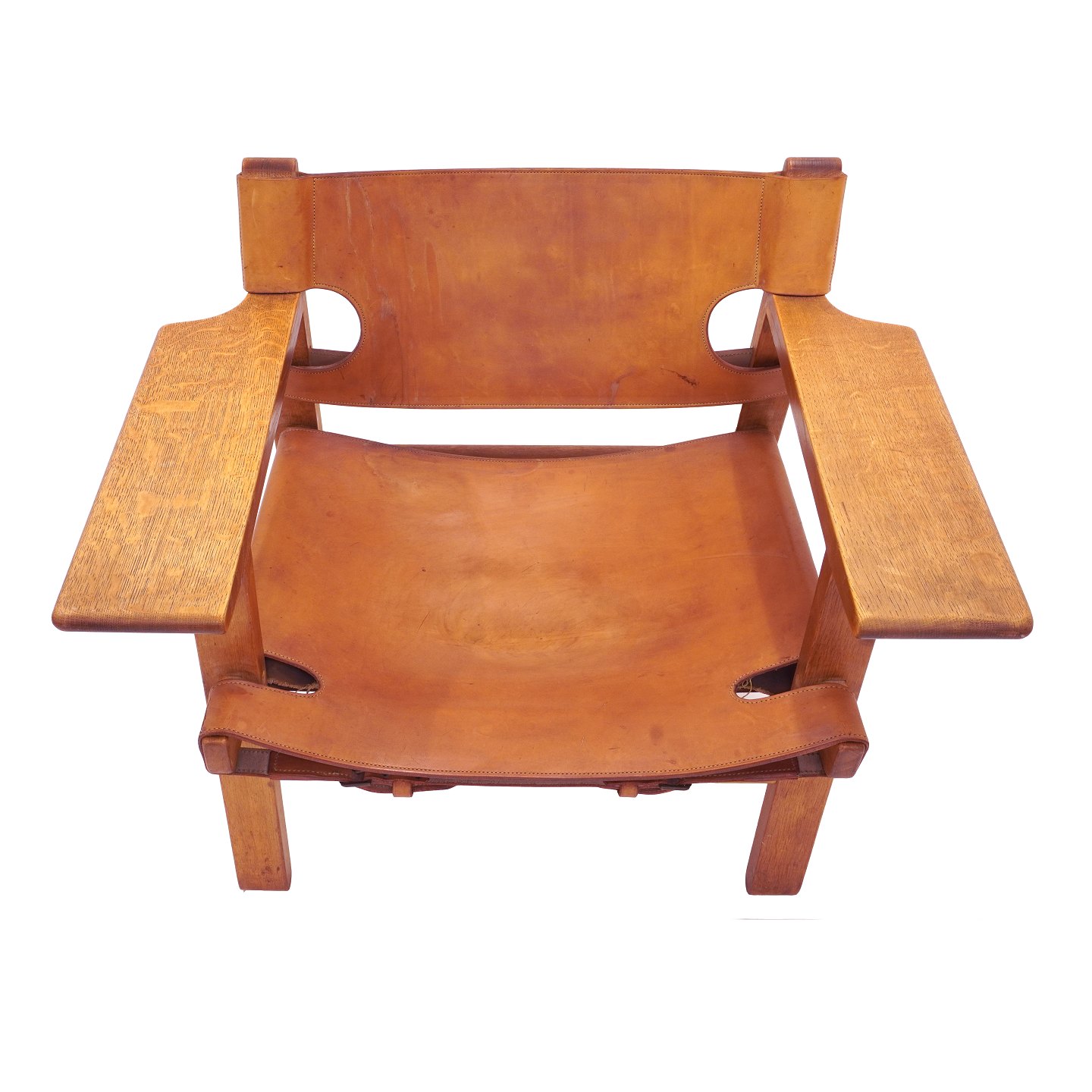 Et par Børge Mogensen Spanske Stole i tidlig version med patineret egestel og kernelæder