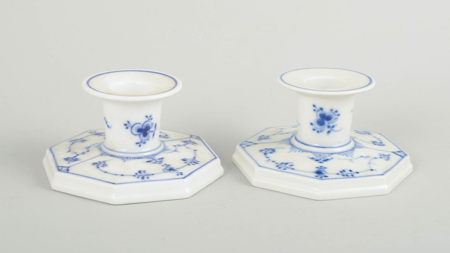 Par lysestager i håndmalet porcelæn fra Musselmalet Riflet med klassisk underglasurdekoration i koboltblå. Model 1/3334. Den ene er første sortering, den anden annulleret med én indridset streg under bunden. Fremstillet 1963.