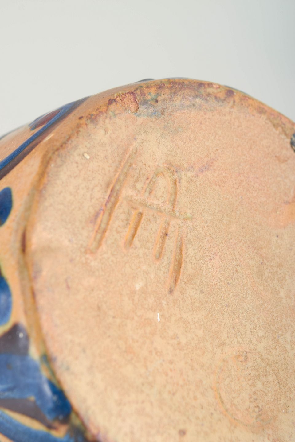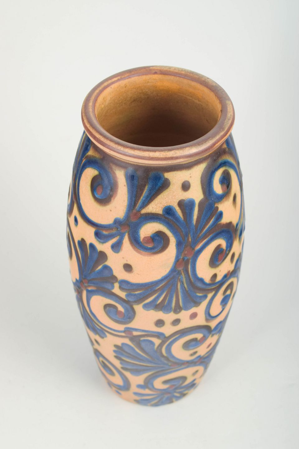 Høj, slank vase i stentøj, hånddekoreret i dyb koboltblå på varm terrakottafarvet bund. Dekorationen består af stiliserede slyngende bladranker og prikornamentik. Stemplet med indridset HAK i bunden. Fremstillet hos Kähler i 1930’erne.