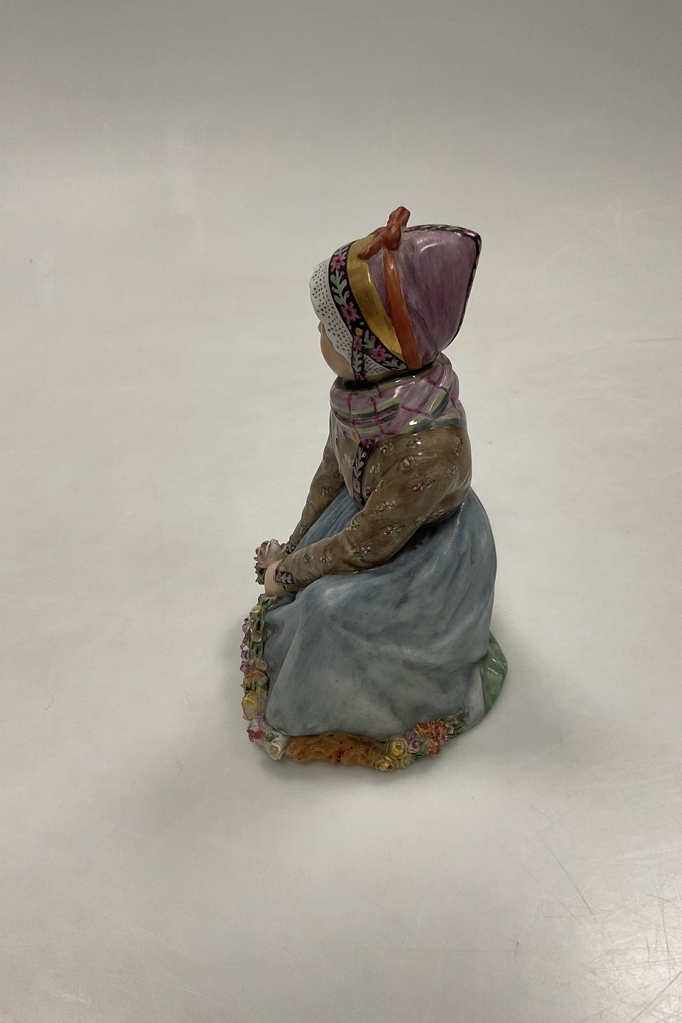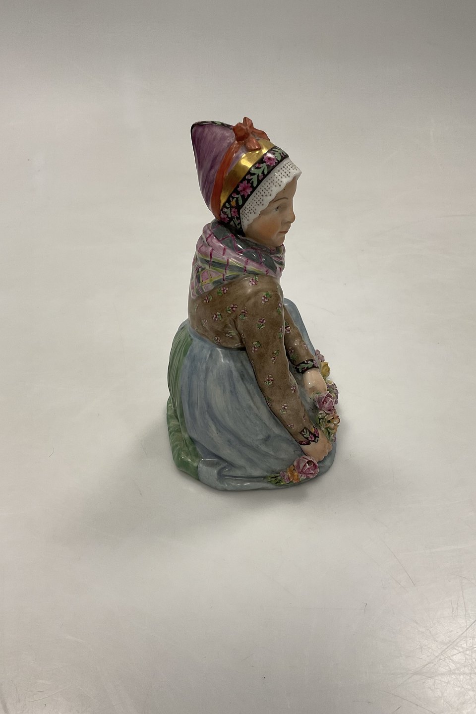Royal Copenhagen Siddende Fanøpige af Carl Martin-Hansen No 12413. Med Juliane Marie stempel. Måler 14,5 cm. 1. sortering, med små¨afslag på blomster - se billeder
