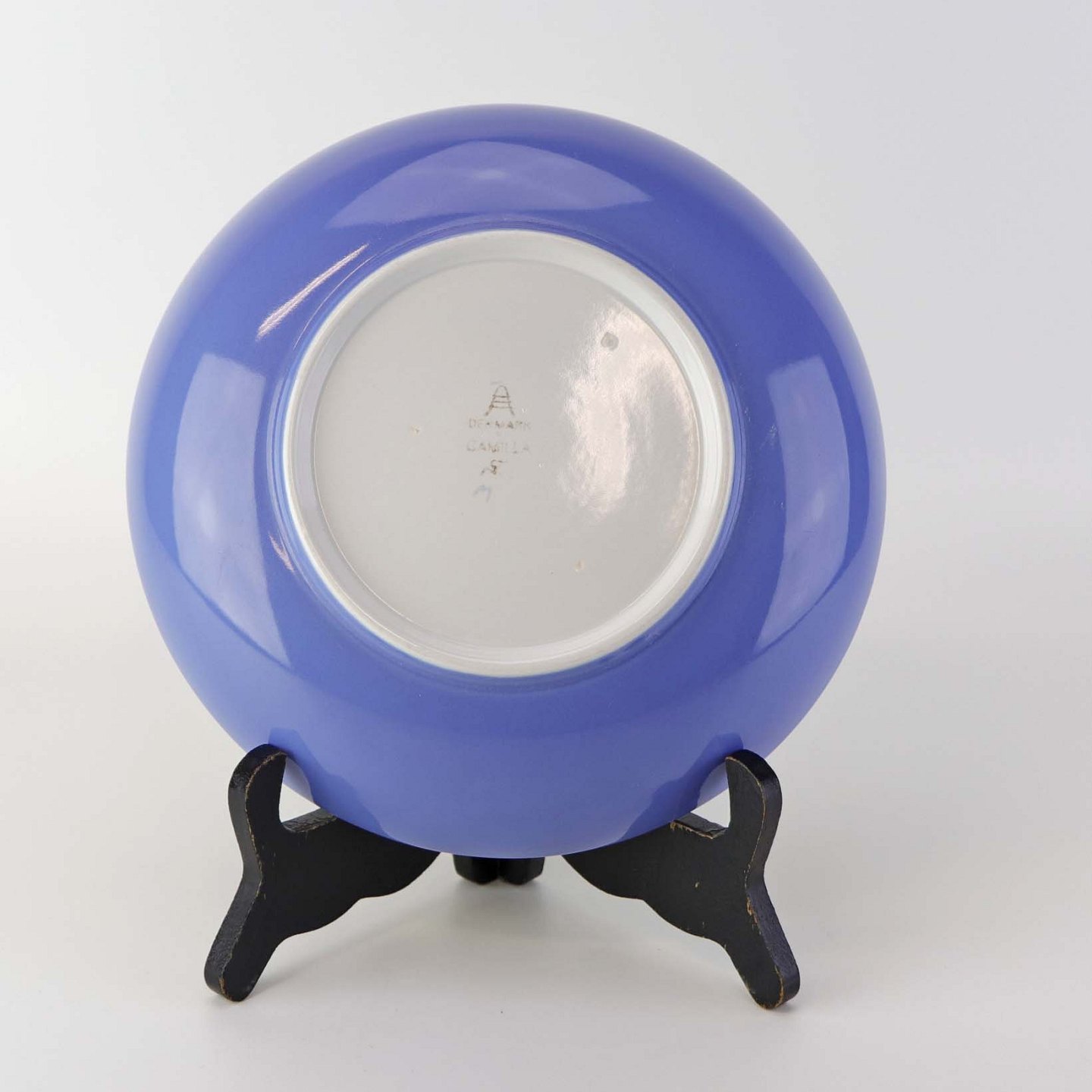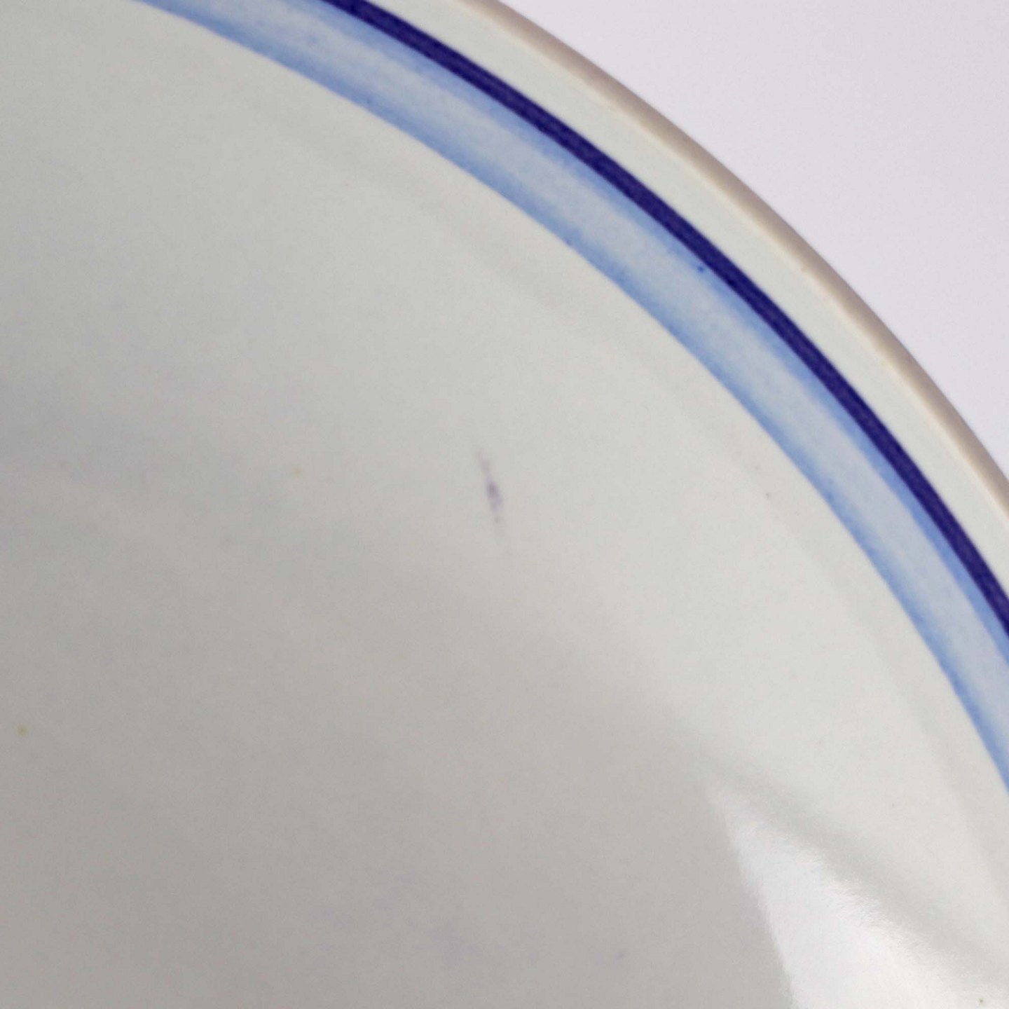 Fremstår med ridser på bagsiden, mindre mørk plet under glasuren.