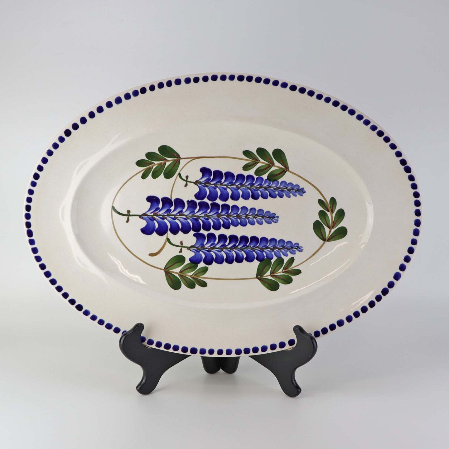 Fajancestel med dekoration af ranker af blåregn og blade på lys baggrund afsluttet med kant af runde blå pletter.