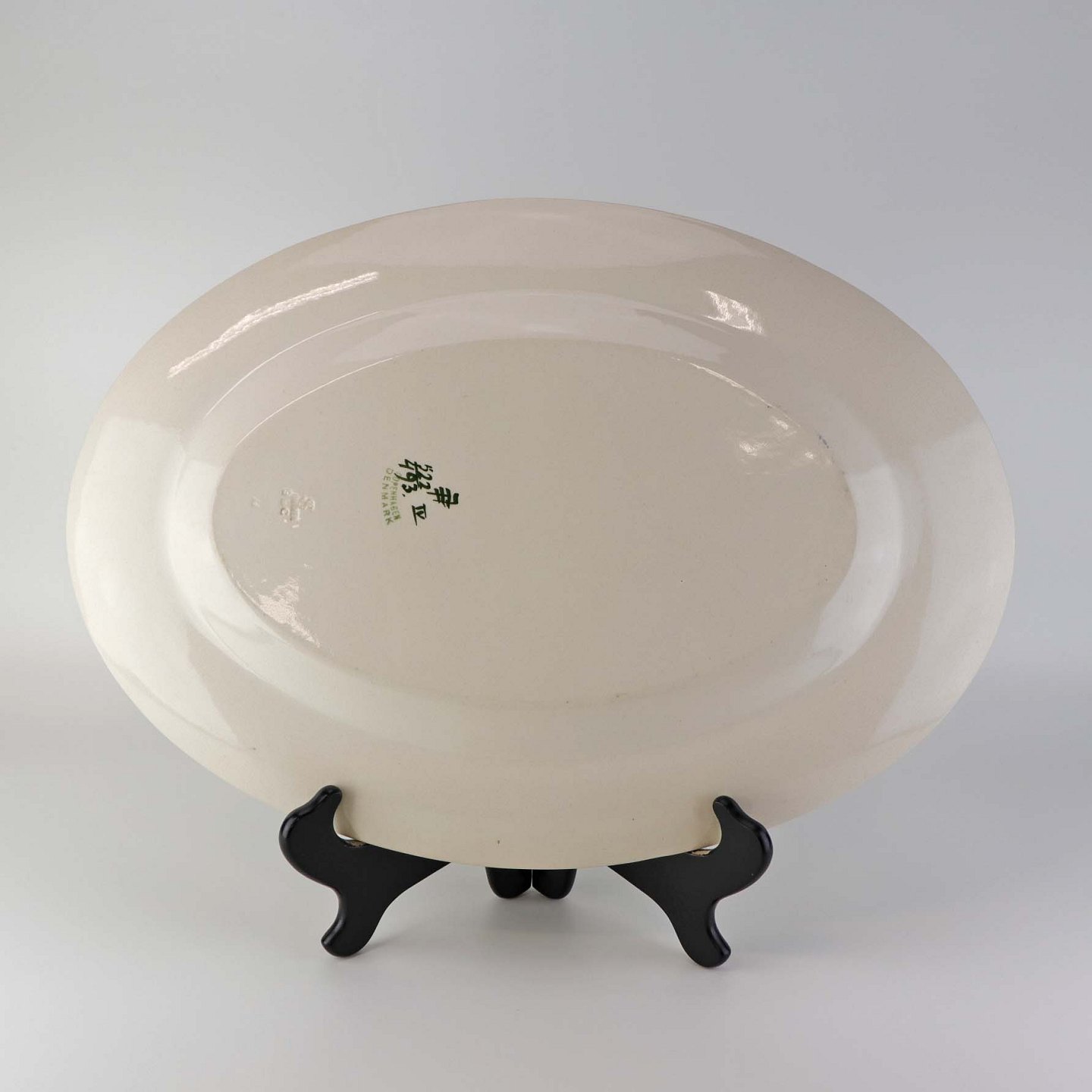 Stort ovalt serveringsfad i fajance fra stellet Blåregn. Stellet er fremstillet i perioden år 1903-1933. Nr. 522/493