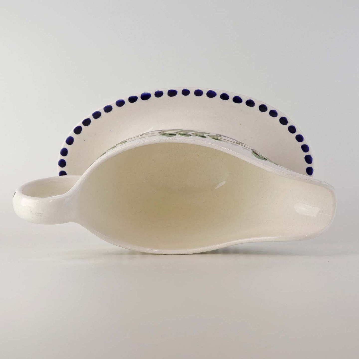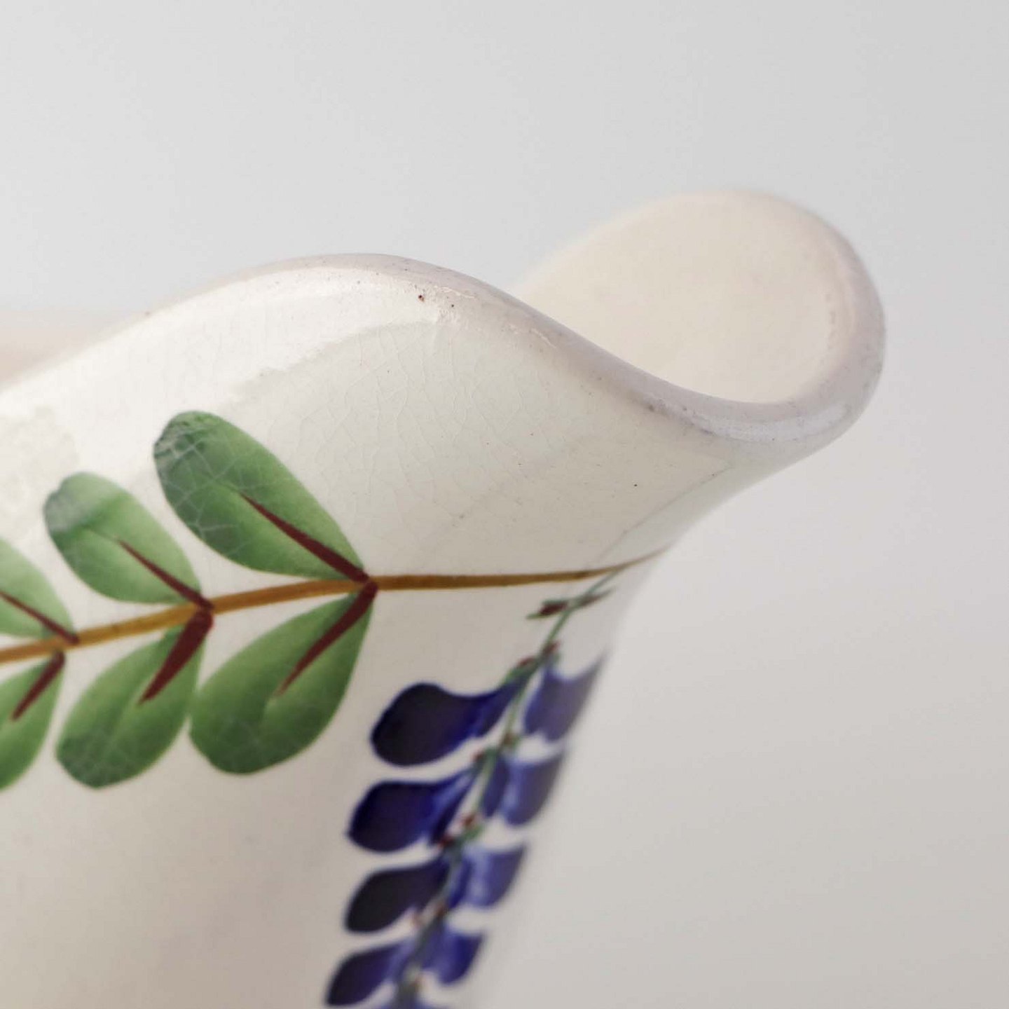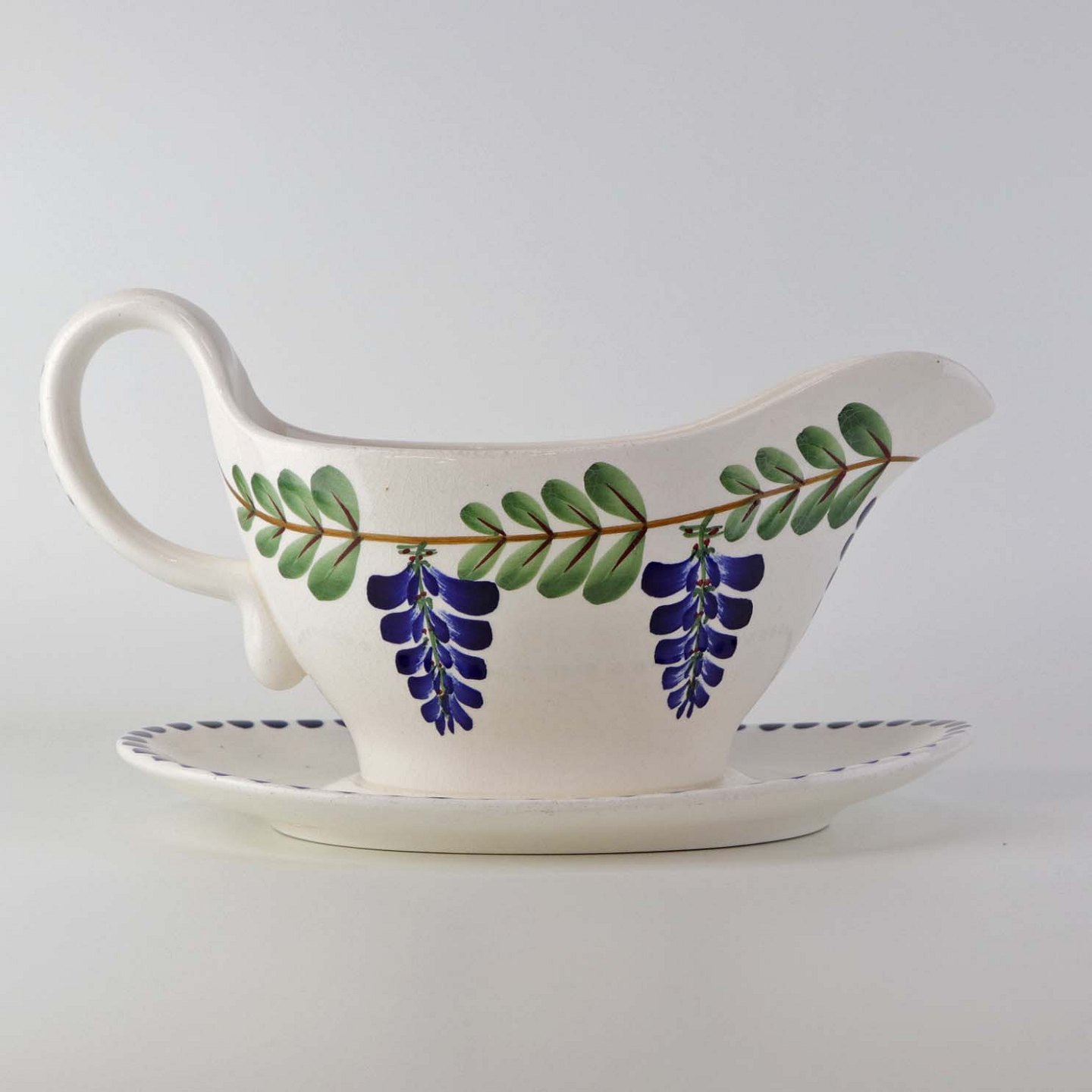 Fajancestel med dekoration af ranker af blåregn og blade på lys baggrund afsluttet med kant af runde blå pletter.