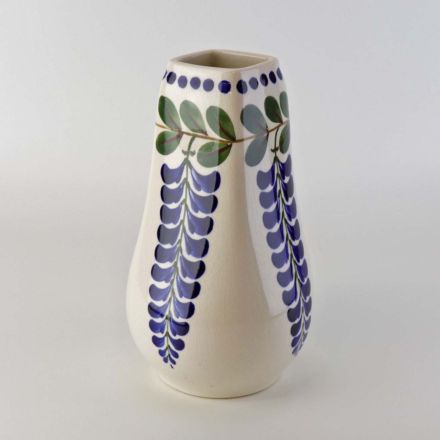 Høj vase i fajance med kantet hals fra stellet Blåregn. Stellet er fremstillet i perioden år 1903-1933. Nr. 522/110