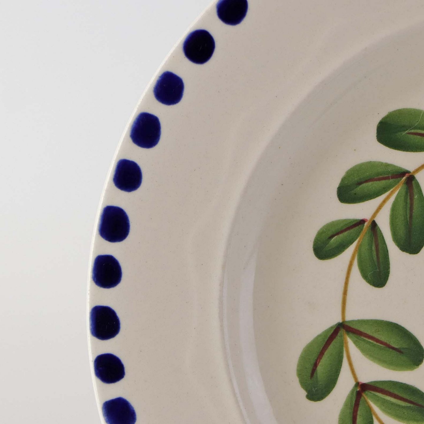 Fajancestel med dekoration af ranker af blåregn og blade på lys baggrund afsluttet med kant af runde blå pletter.
