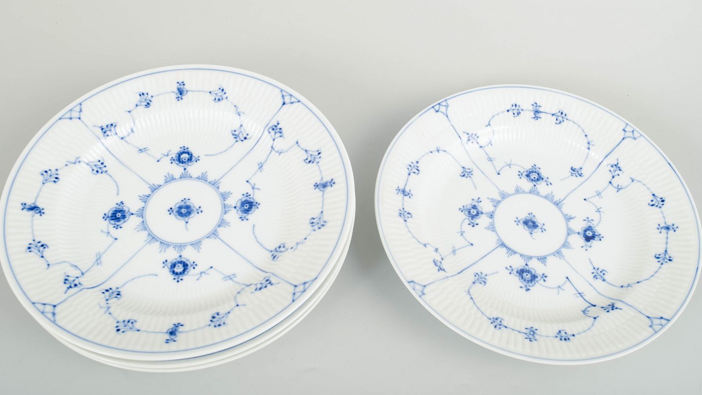 Royal Copenhagen Musselmalet Riflet, sæt af fire middagstallerkener.