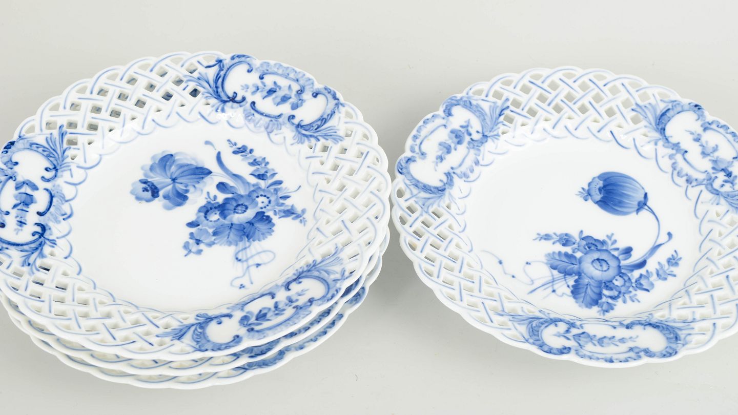 Sæt af fire tallerkener i håndmalet porcelæn fra Blå Blomst med klassisk underglasurdekoration i koboltblå med naturalistisk blomstermotiv og gennembrudt svejfet kant. Model 10/1637. Første sortering. Fremstillet i 1965.