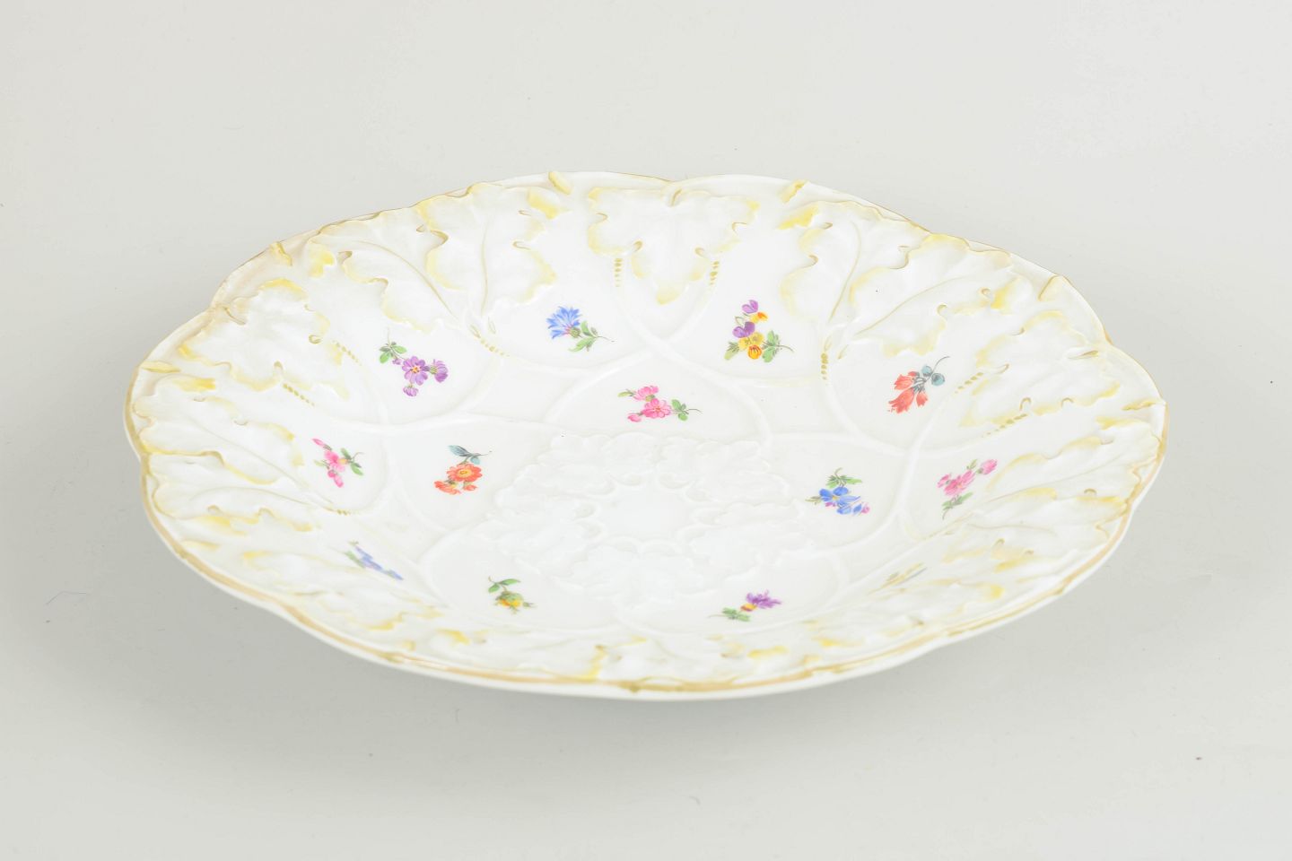 Stort rundt fad i porcelæn med reliefdekoration og håndmalede blomster i polykrome farver samt forgyldt kant.