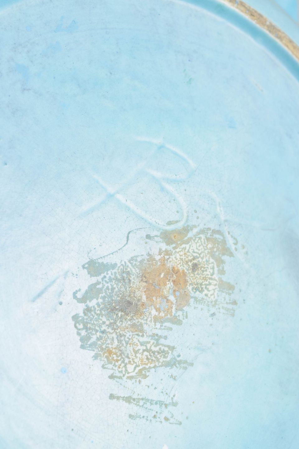 Stor hånddekoreret keramisk skål med bølget rand og polykrom dekoration forestillende stiliseret kvindefigur omgivet af ornamentale motiver.