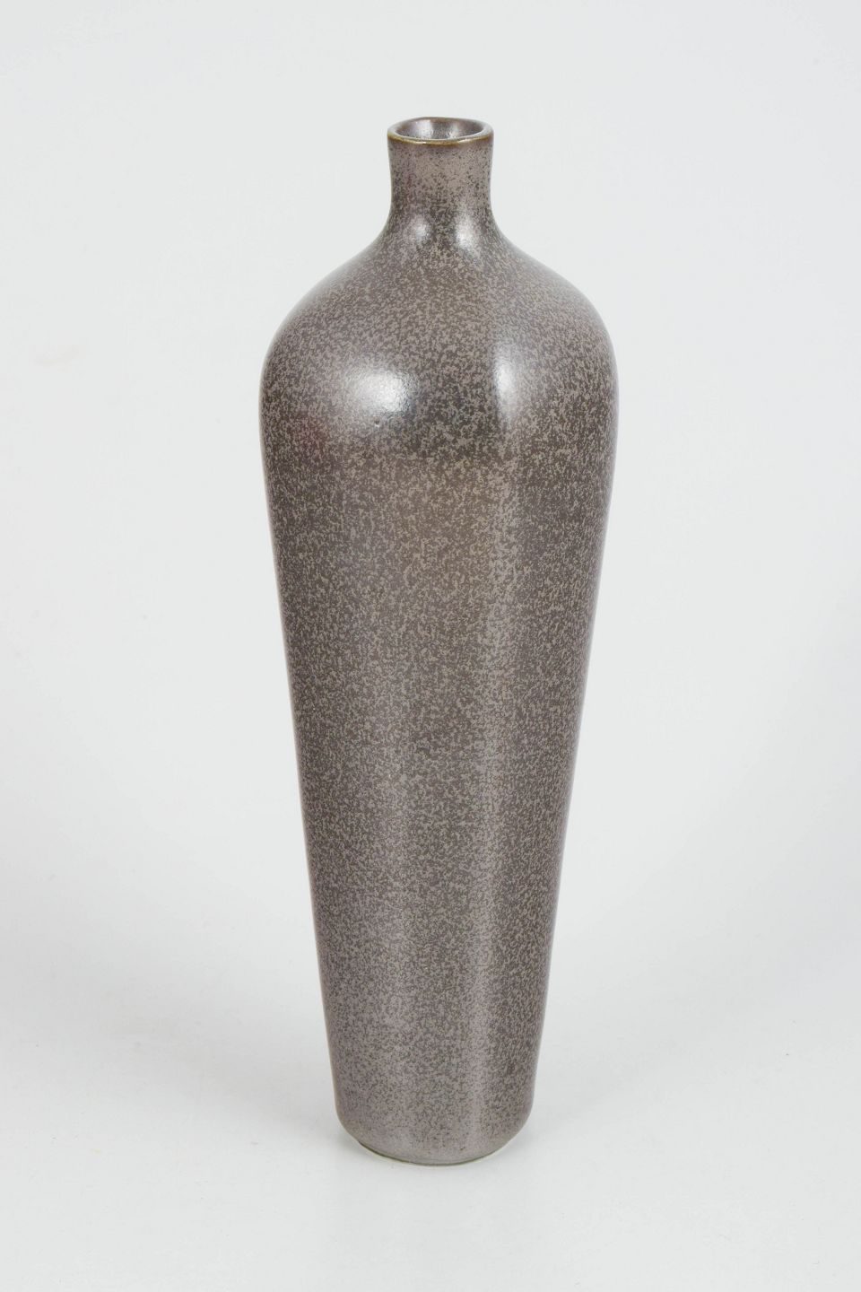 Stor drejet stentøjsvase med slank balusterform og smal hals. Udført i gråbrun harpelsglasur fra Selecta-serien. Stemplet Gustavsberg og Selecta i bunden.