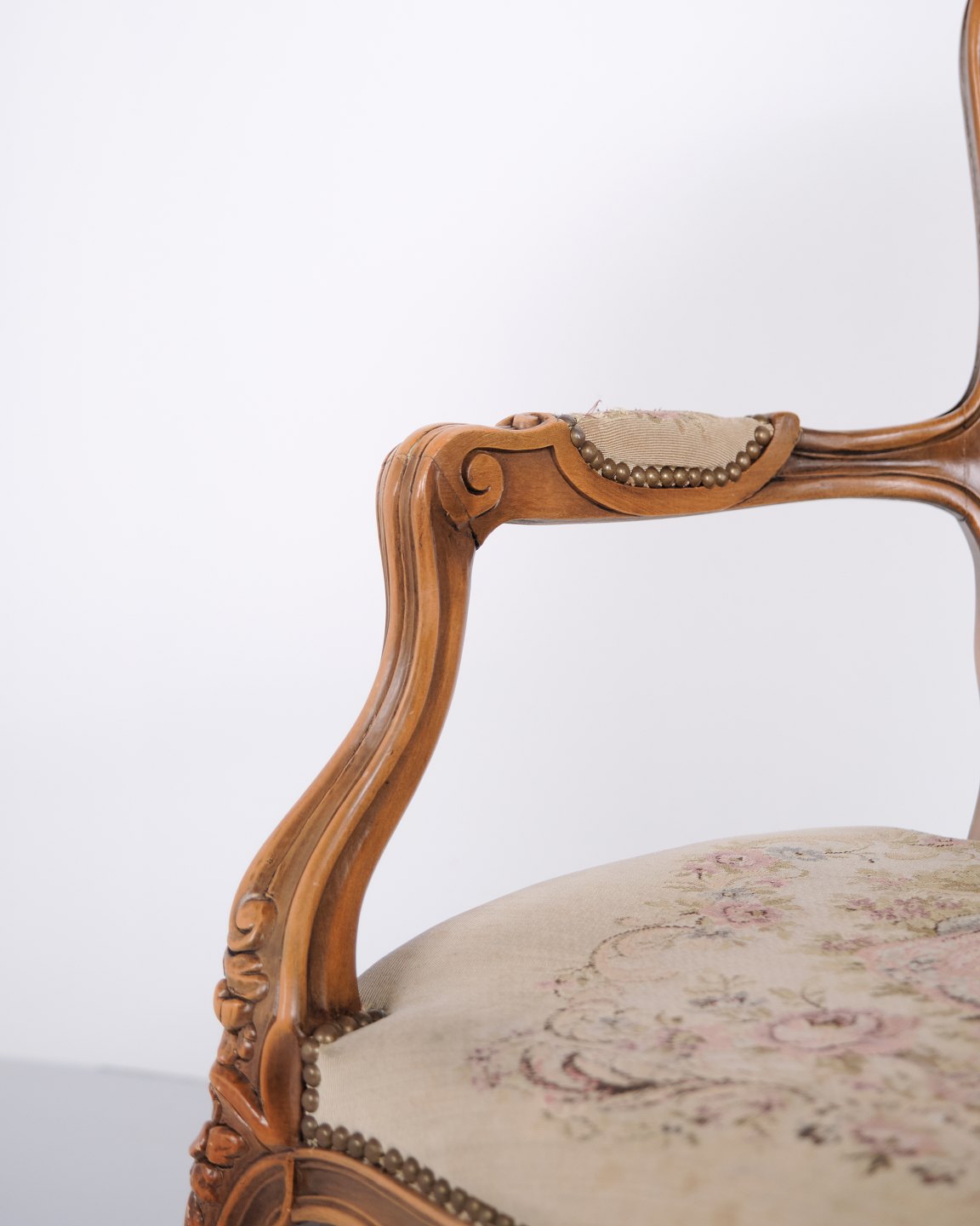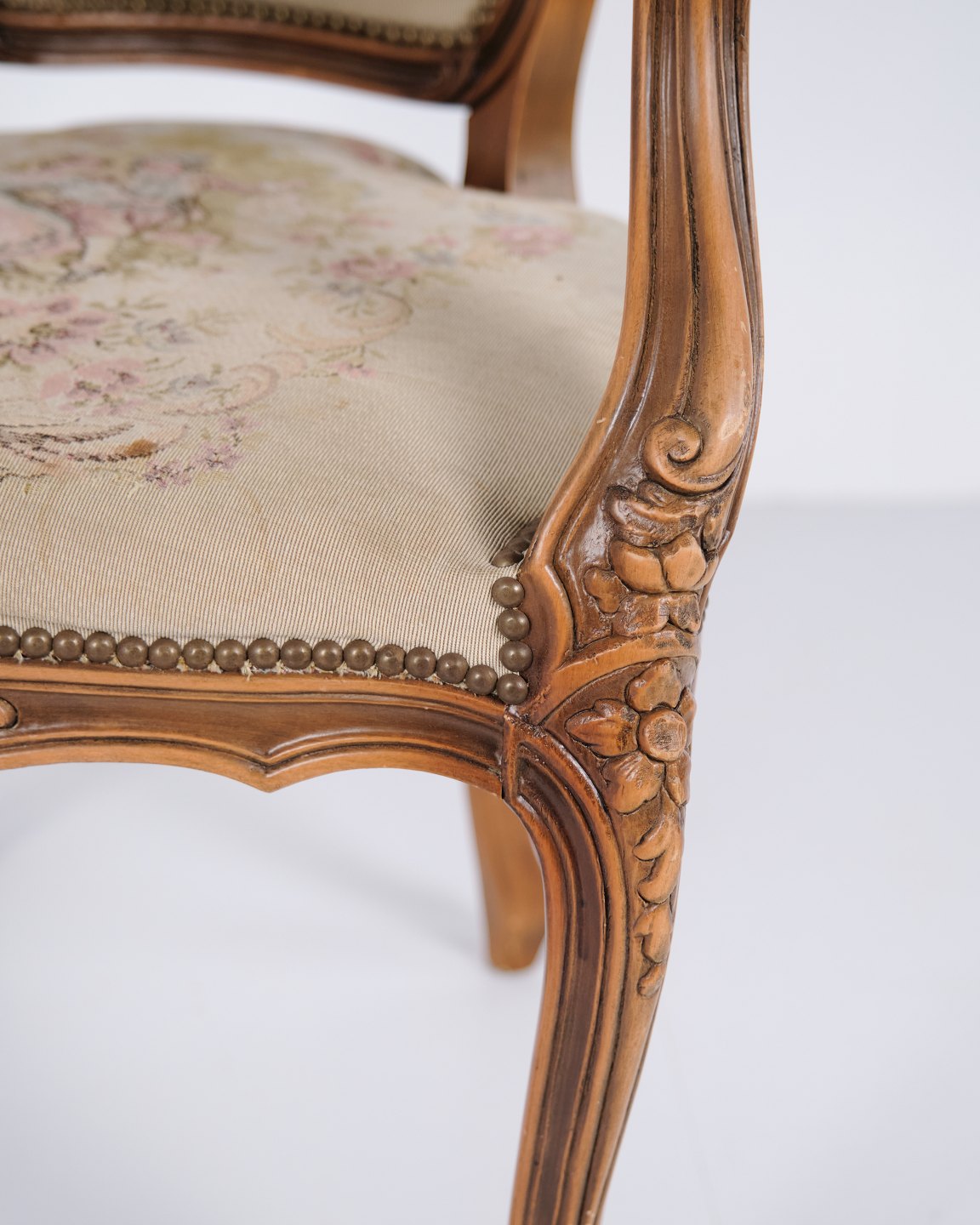Nyrokoko armstol fra 1930’erne med buede ben og mønstret blomstret stof. Klassisk og dekorativt møbel i elegant stil.