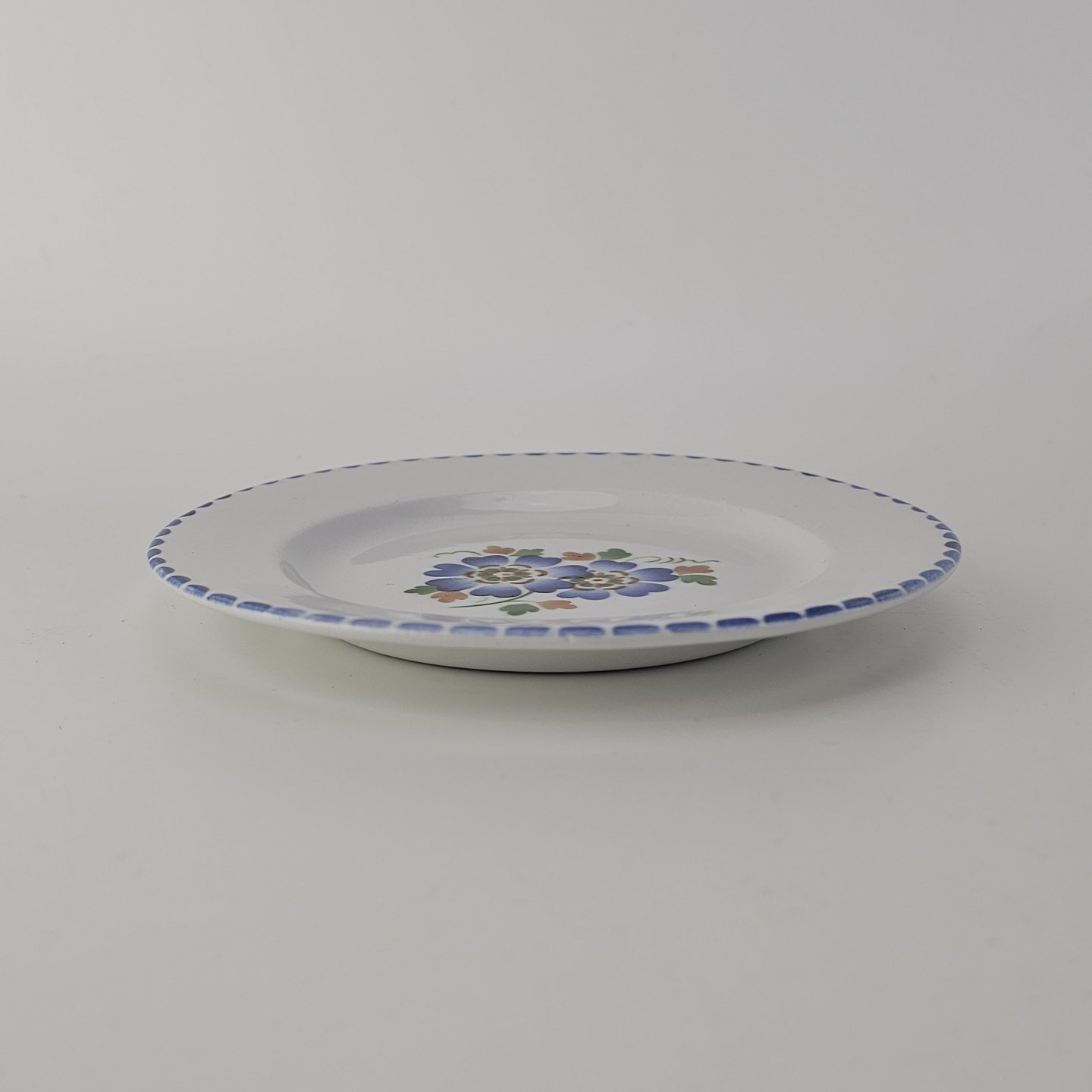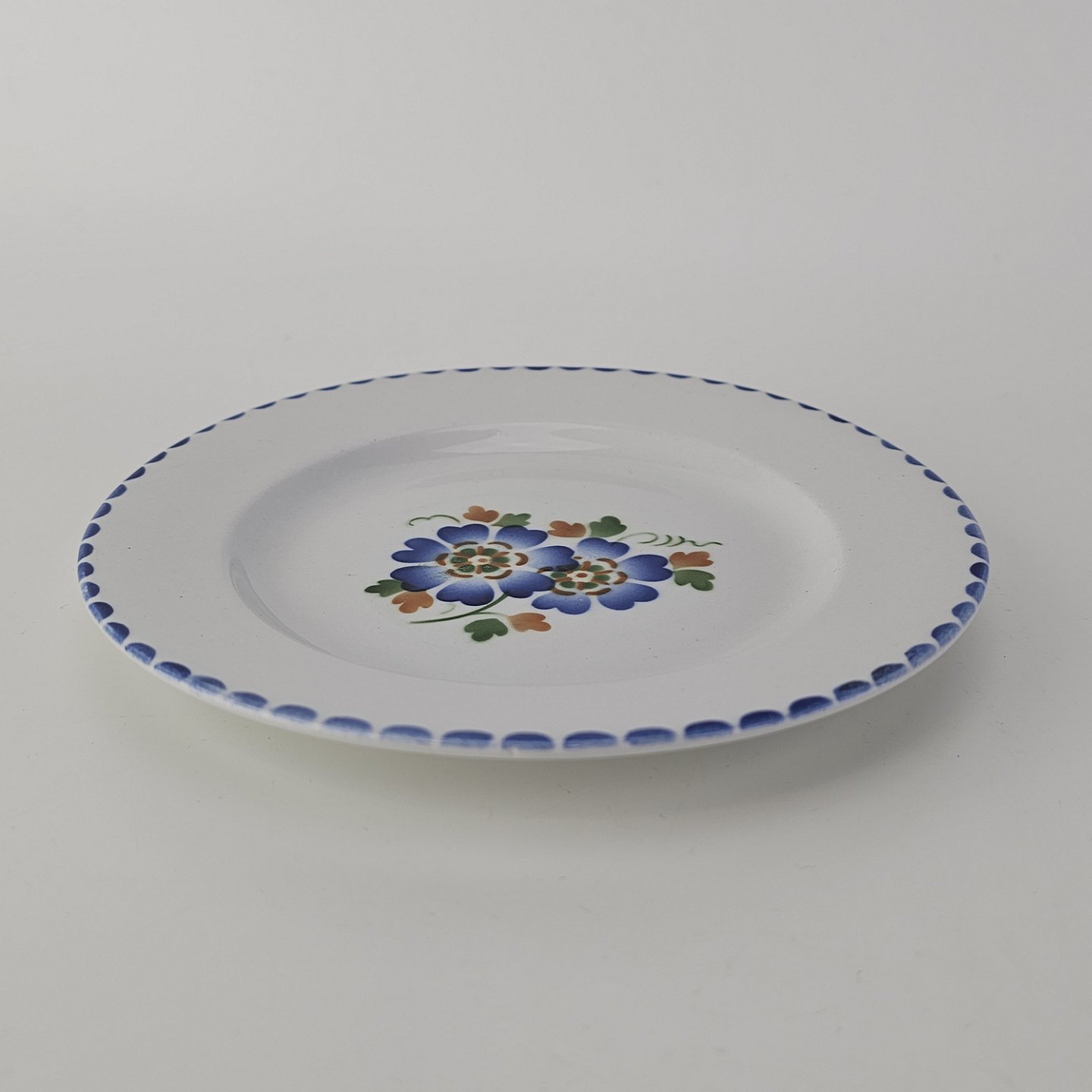 Hvidt fajancestel i stelform Sterling med motiv af blå blomster og blå prikker på kanten.