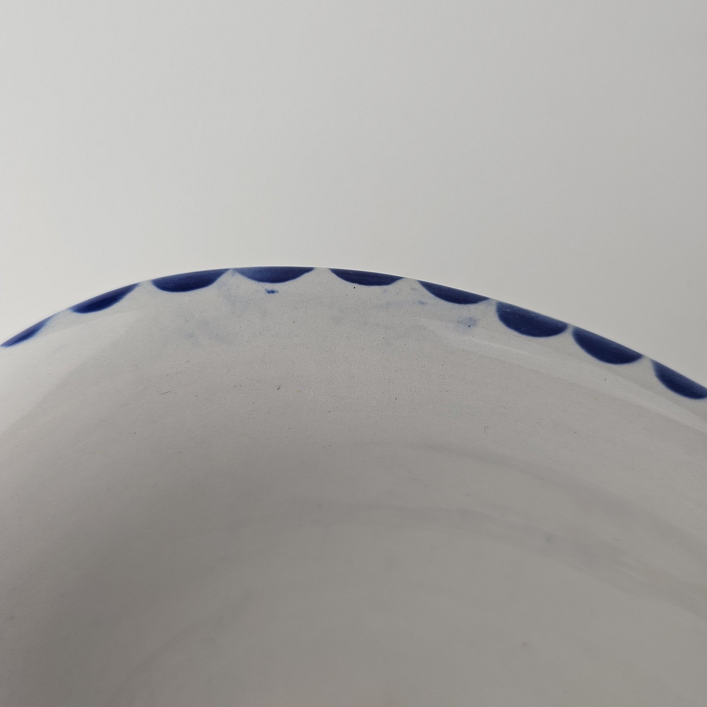 Hvidt fajancestel i stelform Sterling med motiv af blå blomster og blå prikker på kanten.
