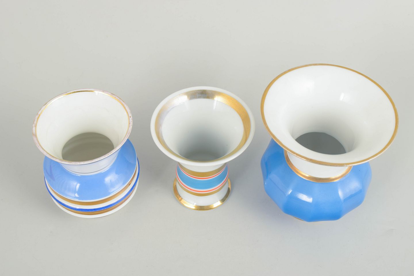 Tre små vaser i porcelæn med klassiske art deco former og dekoration i blå og hvide nuancer med stafferinger i guld. Vaserne fremstår med elegante proportioner og karakteristisk stil fra tysk porcelænsproduktion i mellemkrigstiden.