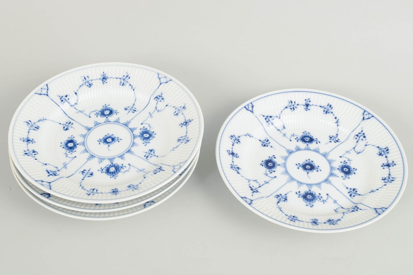 Sæt af fire frokosttallerkener i håndmalet porcelæn fra Musselmalet Riflet med klassisk underglasurdekoration i koboltblå og riflede felter. Model 1/178. Diameter 21 cm. Første sortering. Fremstillet i 1980’erne.