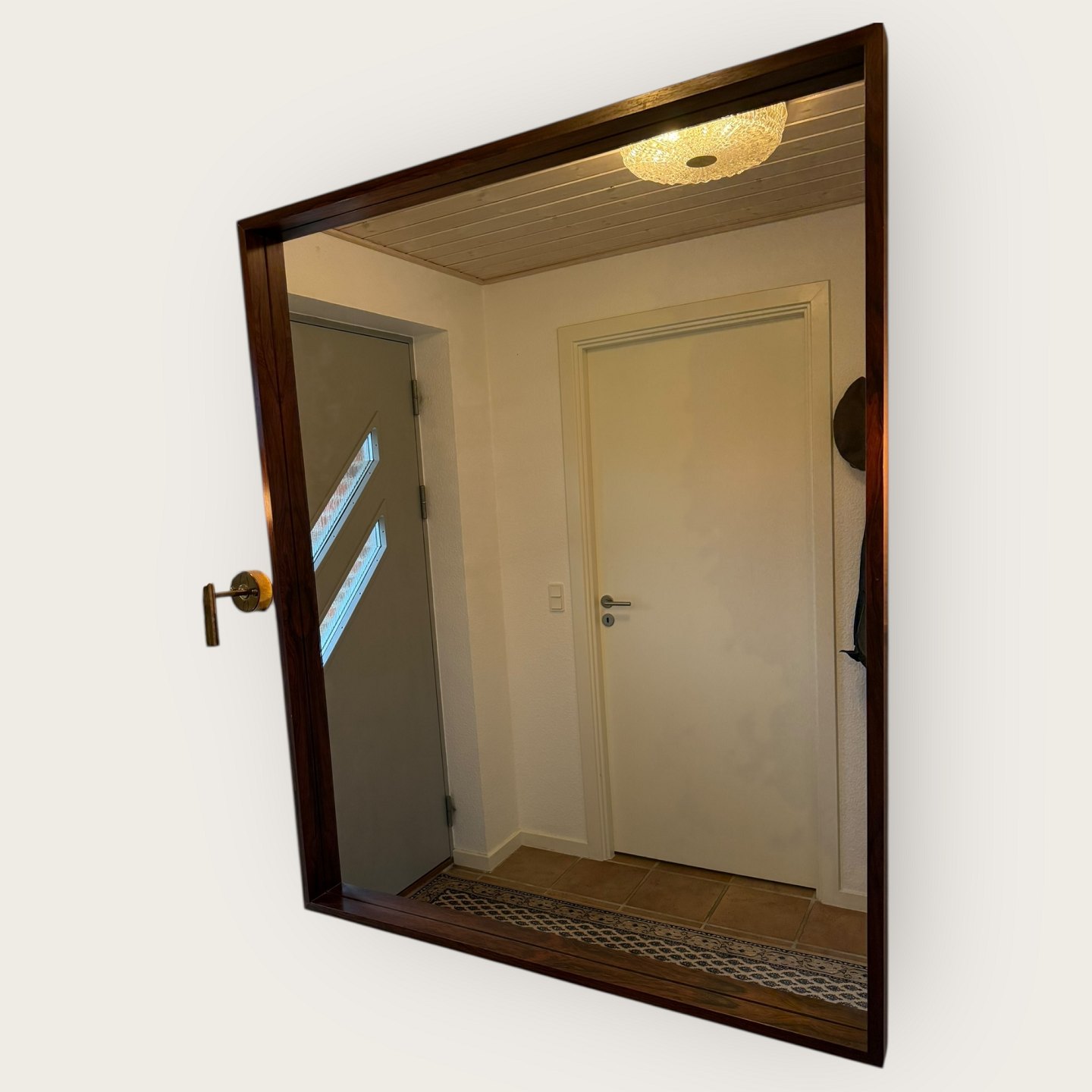 Stort palisander spejl med kraftig ramme. Har været entresæt sammen med skænken varenr. 632824, Udgået og mærket fra Illums Bolighus, Mål: 100x123cm *Flot stand*