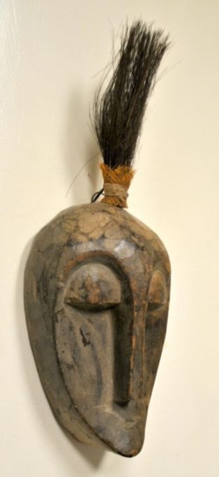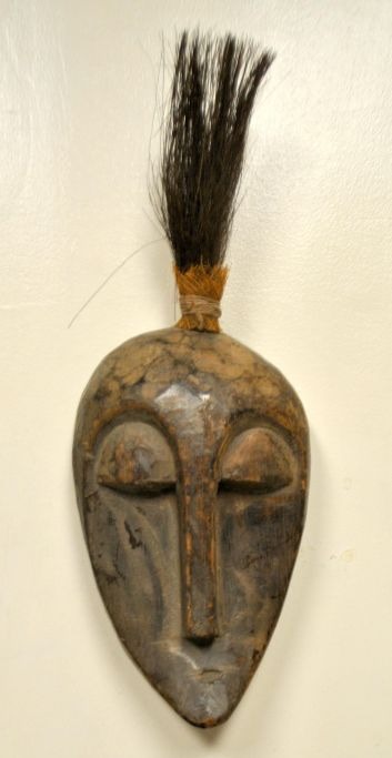 Lille udskåret afrikansk træmaske, medio 1900-tallet. Top af dyrehår. H: 30 cm.