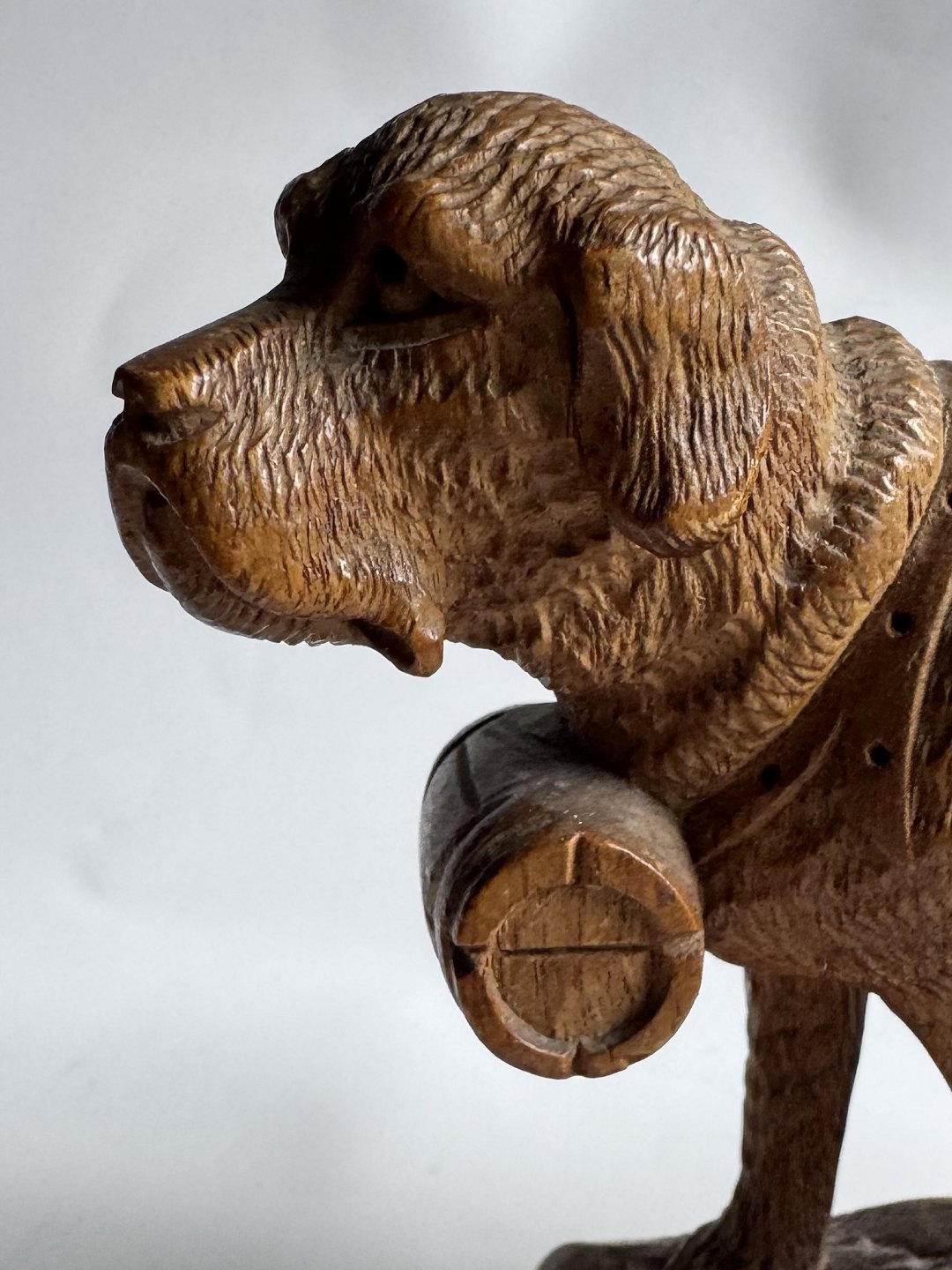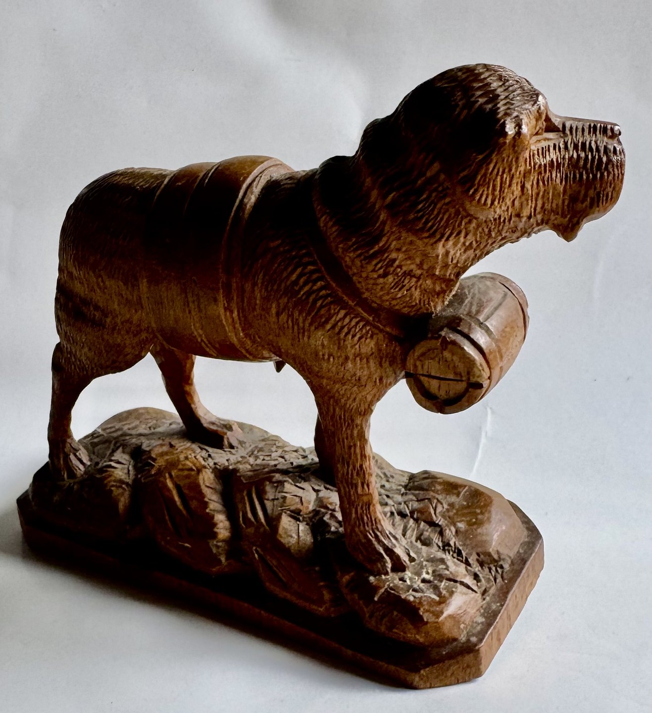 Udskåret figur i lindetræ forestillende en Sankt Bernard hund med den evige tønde i træ rundt om halsen. Fremstillet i Schweiz i begyndelsen af 20. århundrede. Fremstår i god stand uden skader eller reparationer. Mål: H. 12,5 cm. Basen måler 6,2 x 13,4 cm.