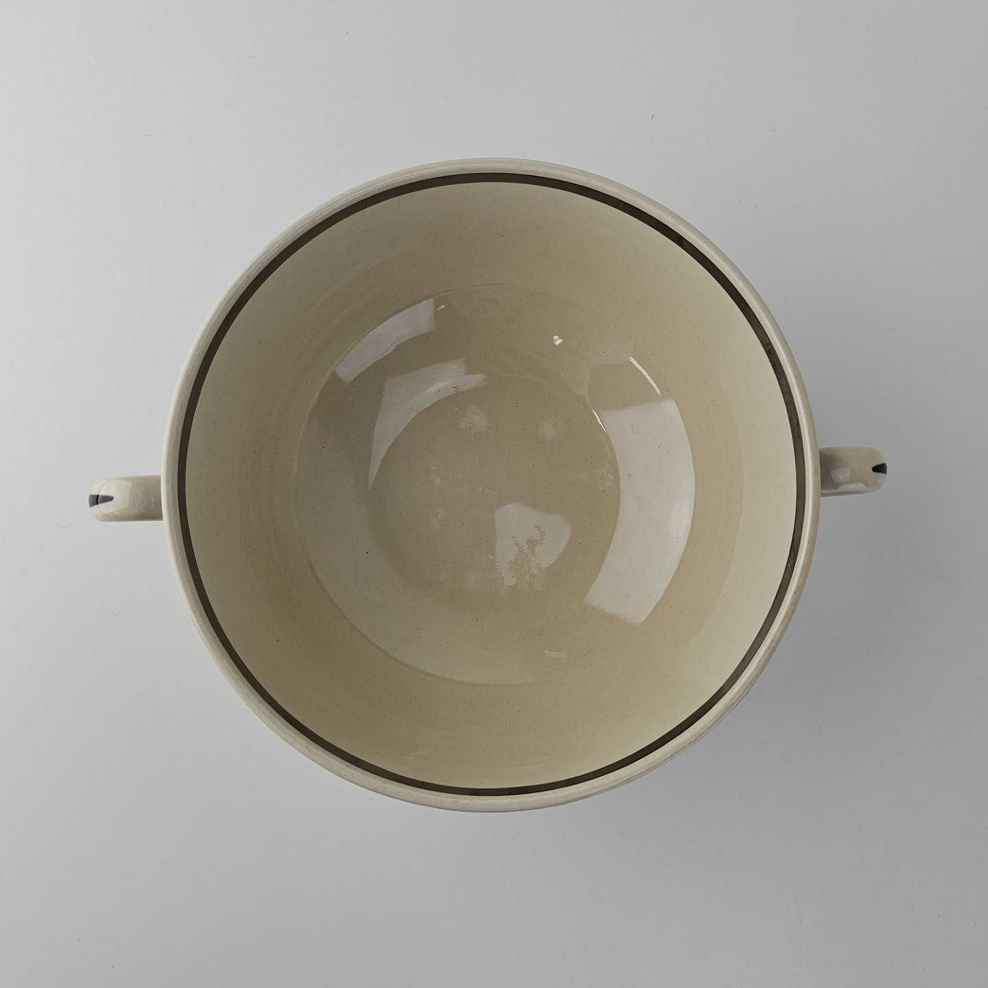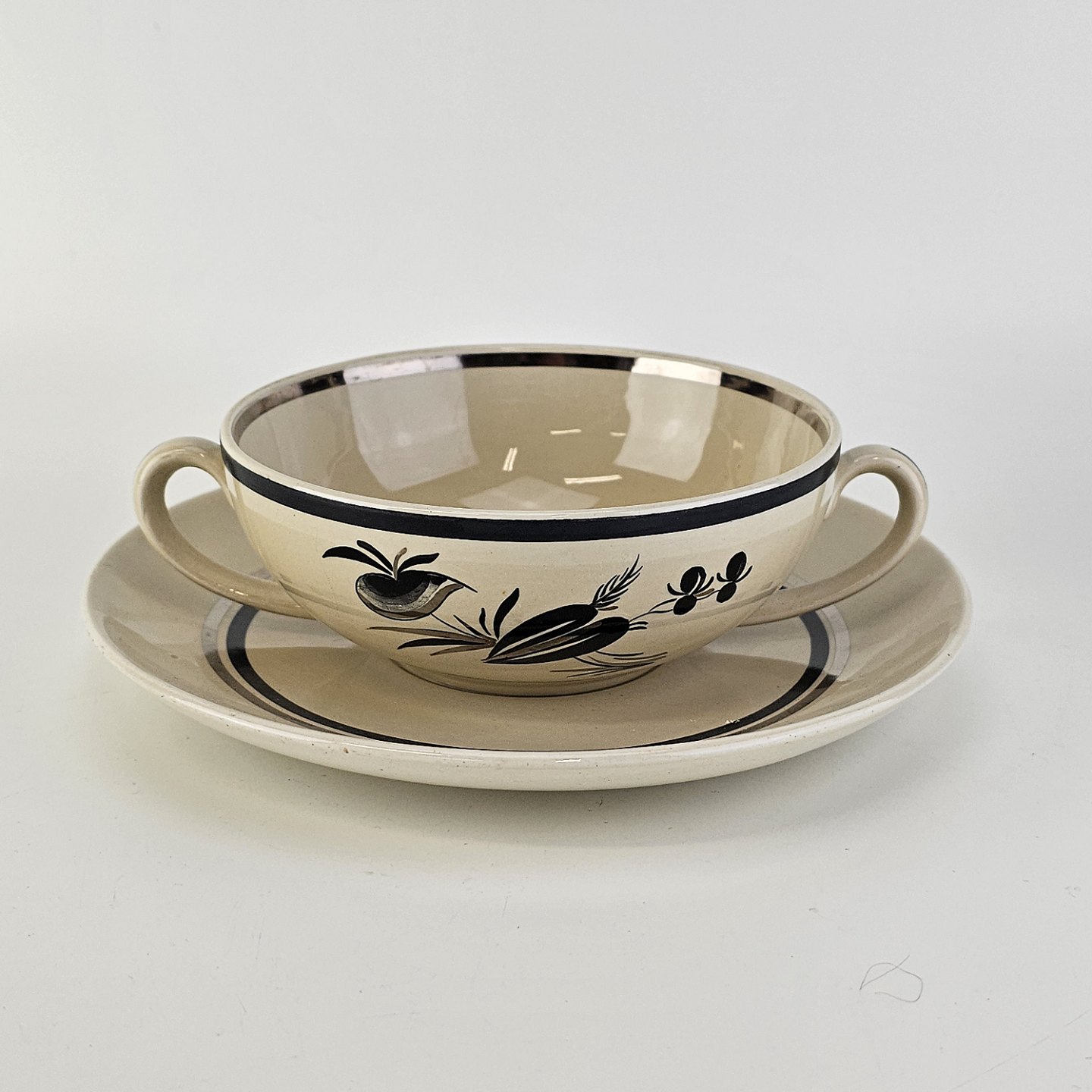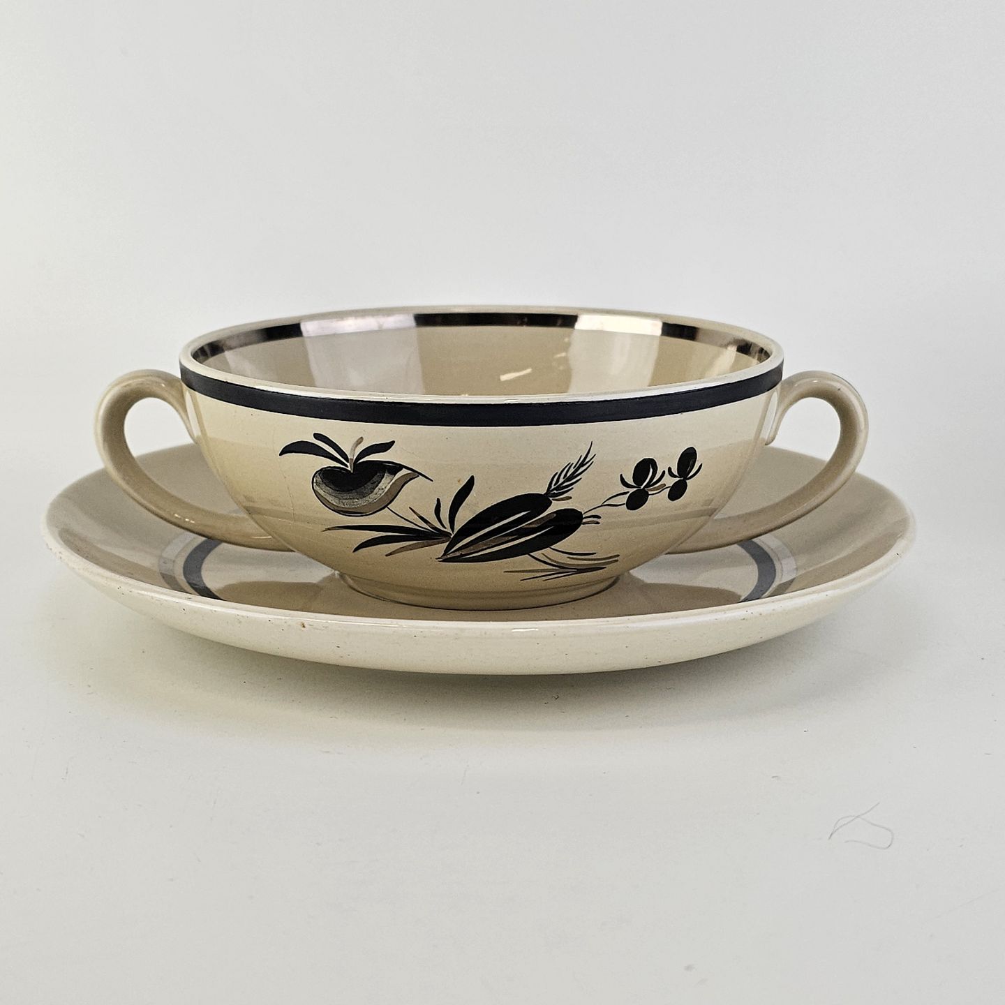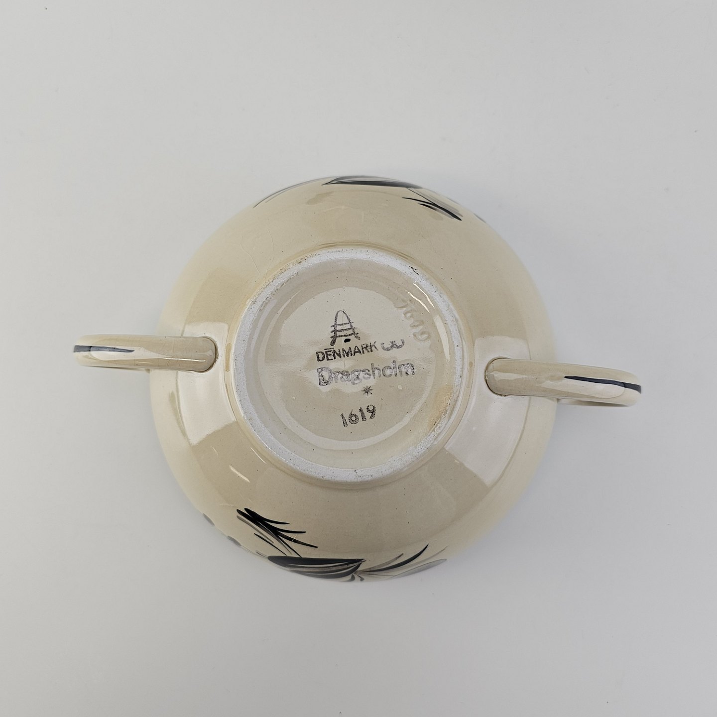 Bouillonkop med underkop i fajance fra stellet Dragsholm fremstillet i perioden 1934-1965.
