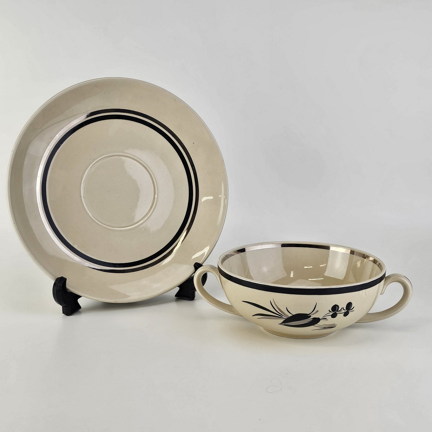 Råhvidt fajancestel i stelform E med dekoration af naturmotiver i sølv og sort farve.