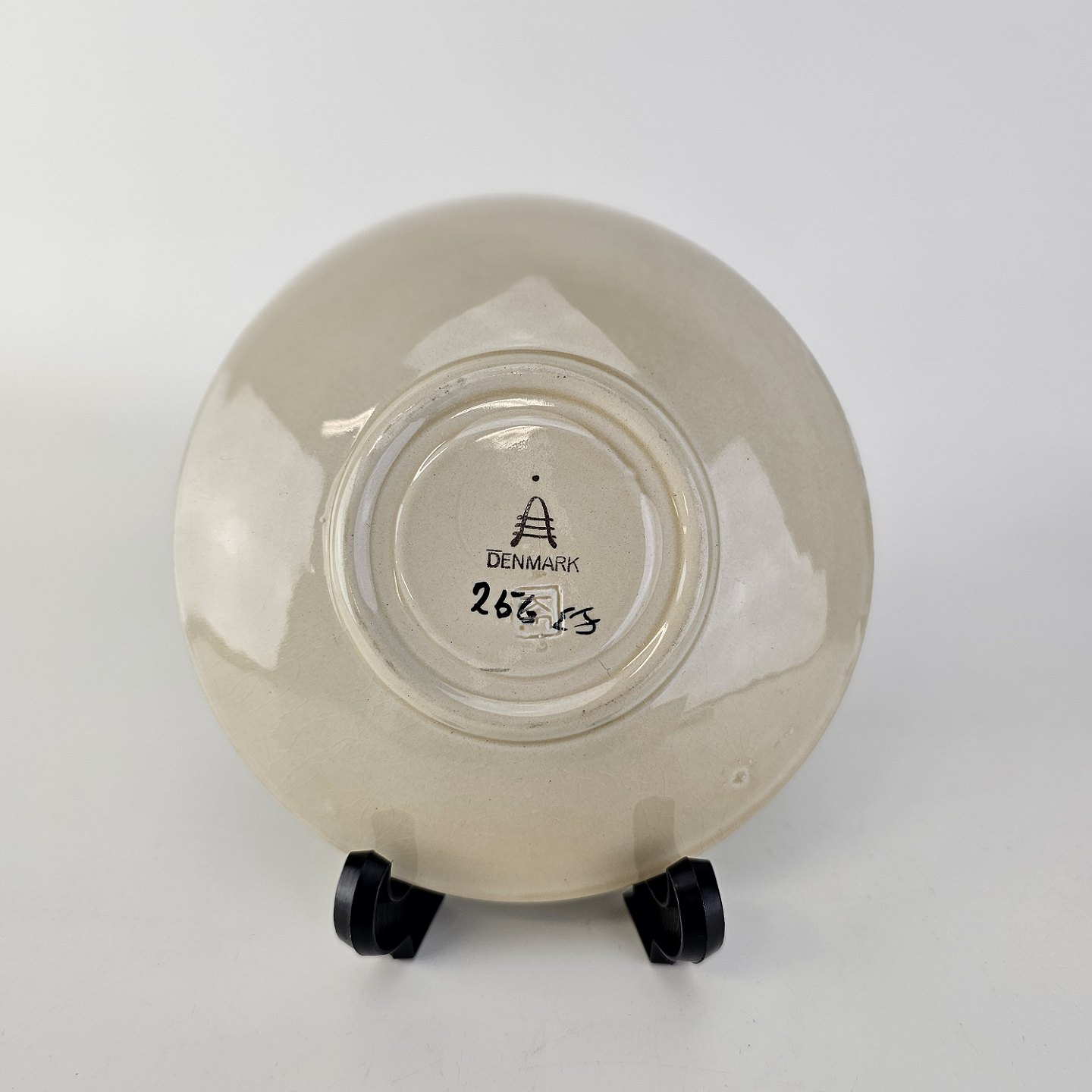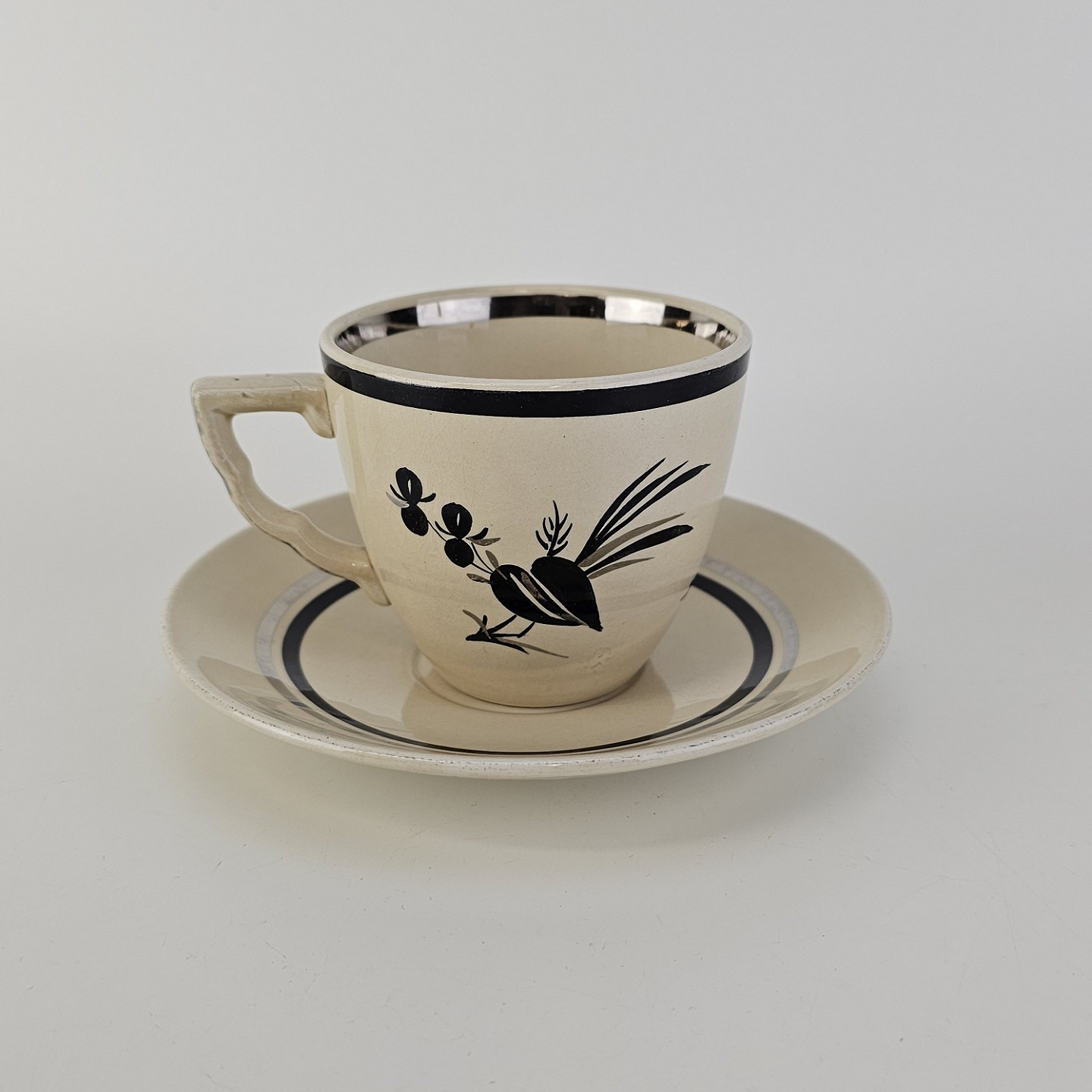 Kop med underkop med art nouveau hank i fajance fra stellet Dragsholm fremstillet i perioden 1934-1965.