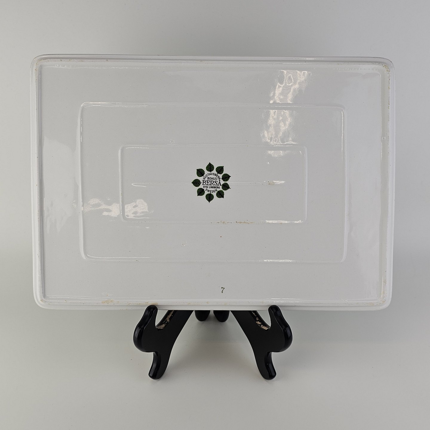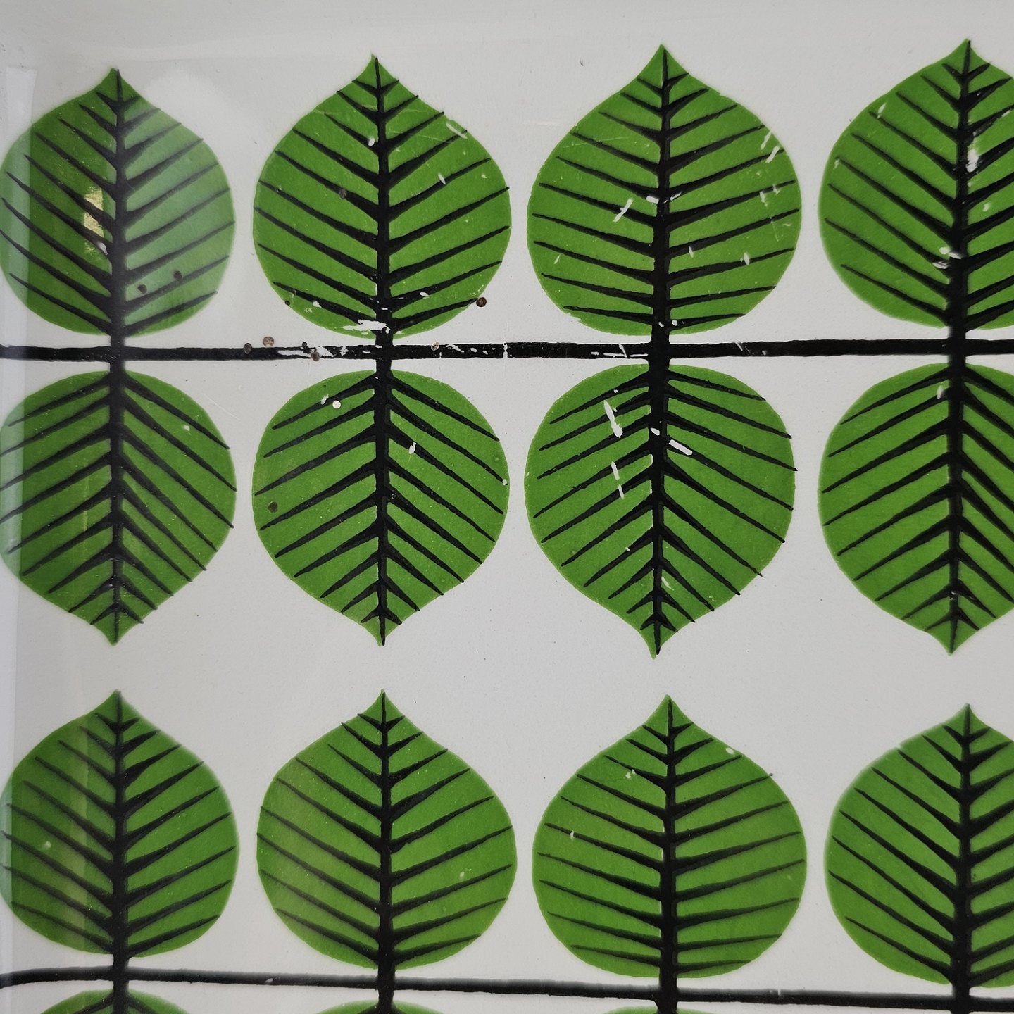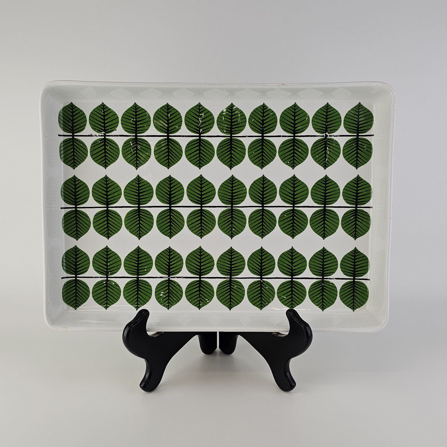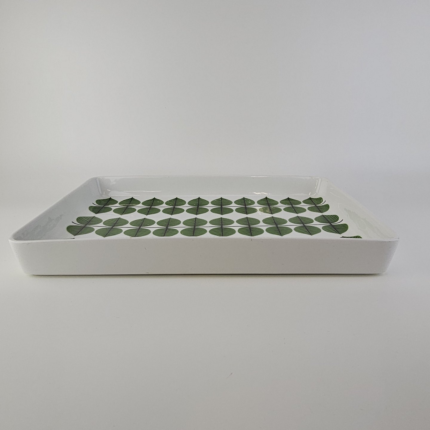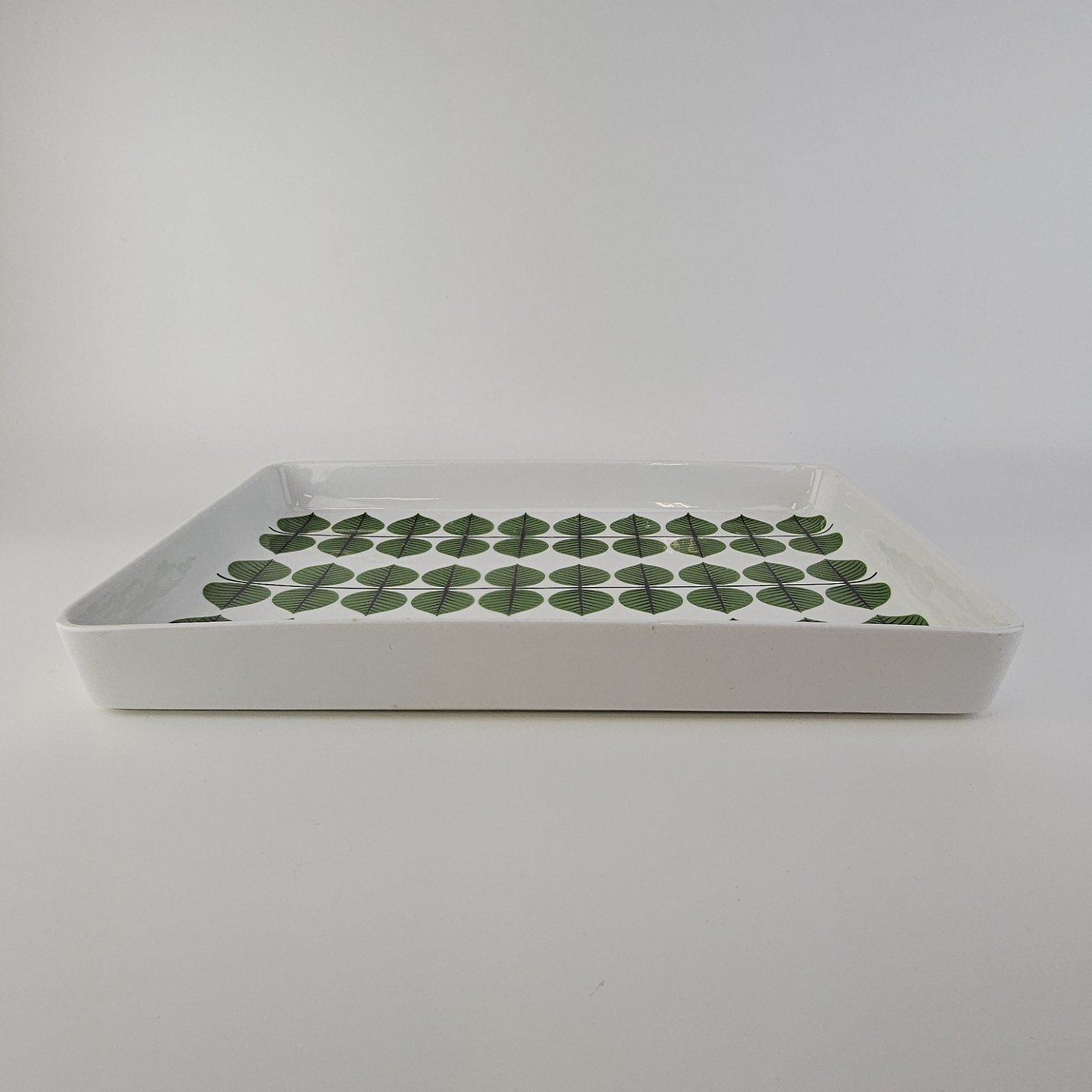 Stel i hvidt porcelæn med dekoration af grønne blade.