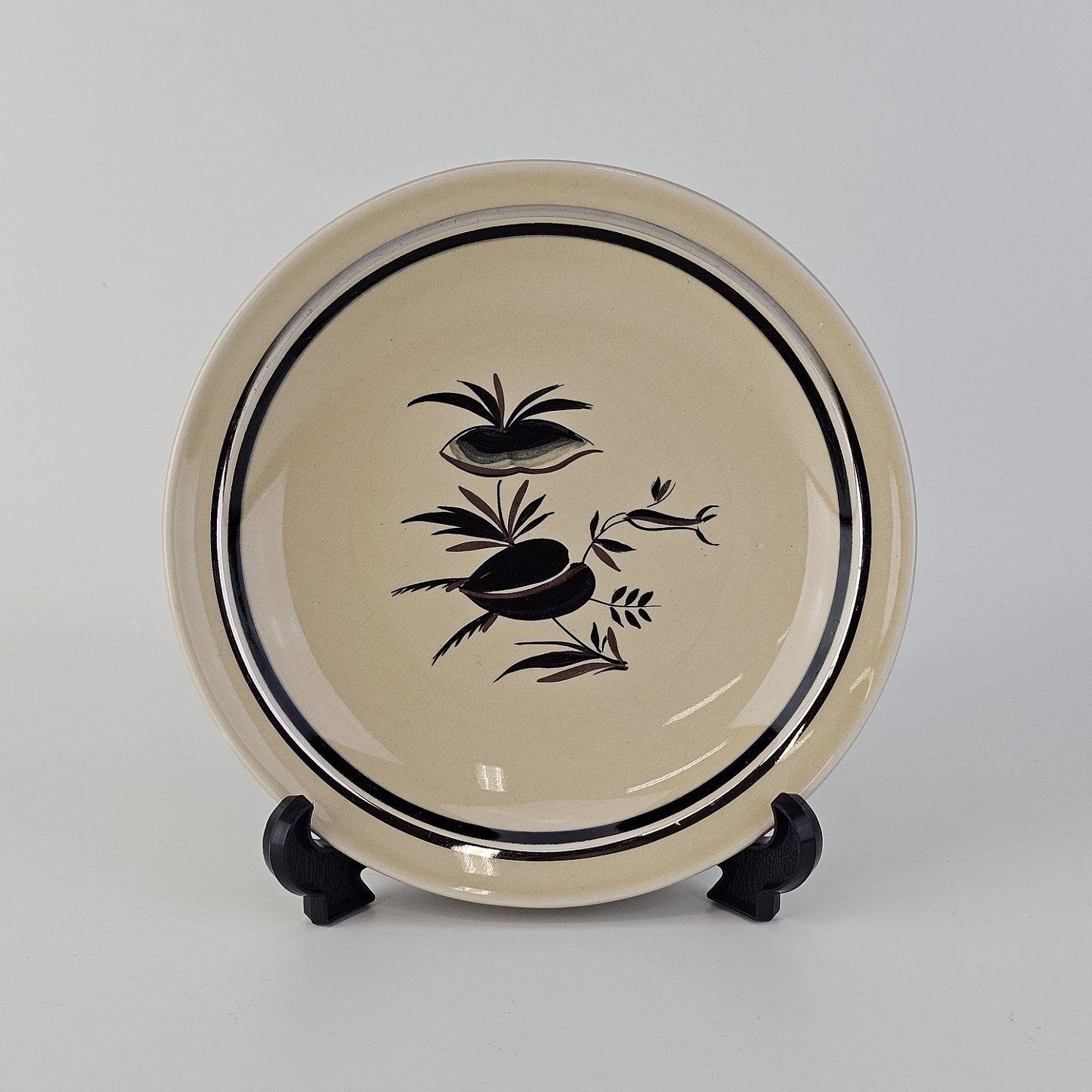 Råhvidt fajancestel i stelform E med dekoration af naturmotiver i sølv og sort farve.