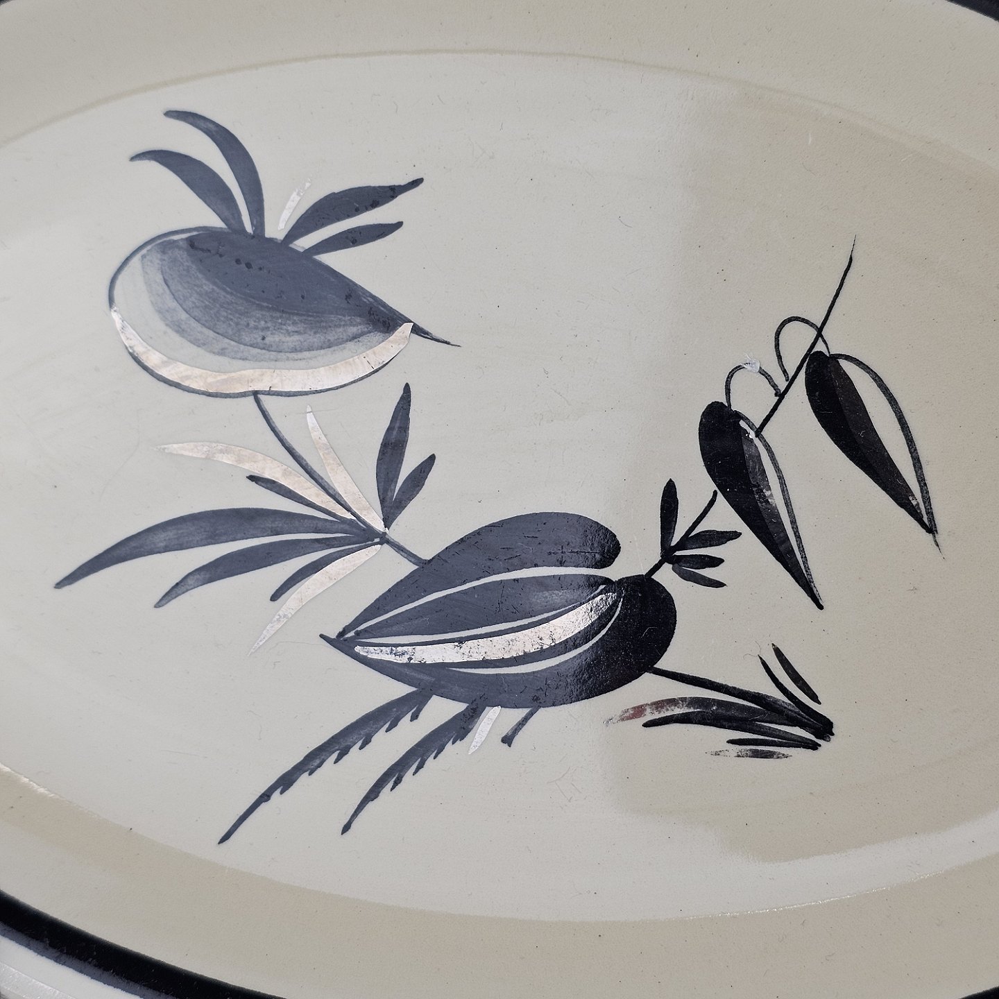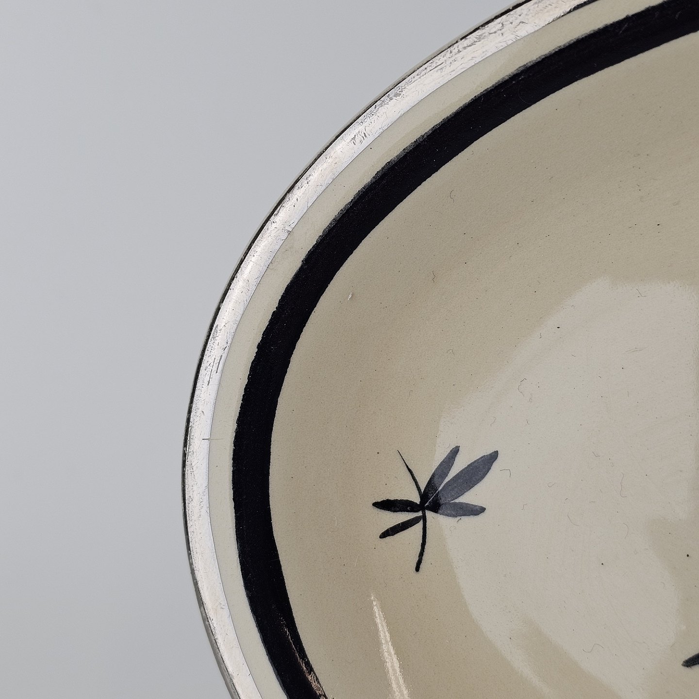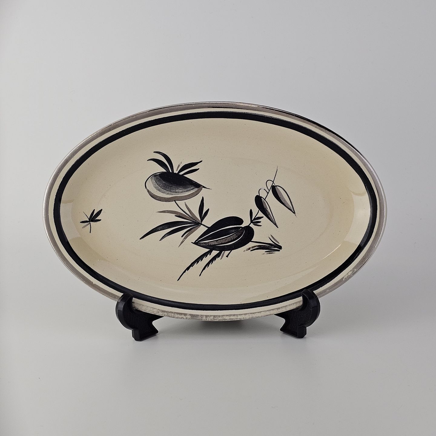 Råhvidt fajancestel i stelform E med dekoration af naturmotiver i sølv og sort farve.
