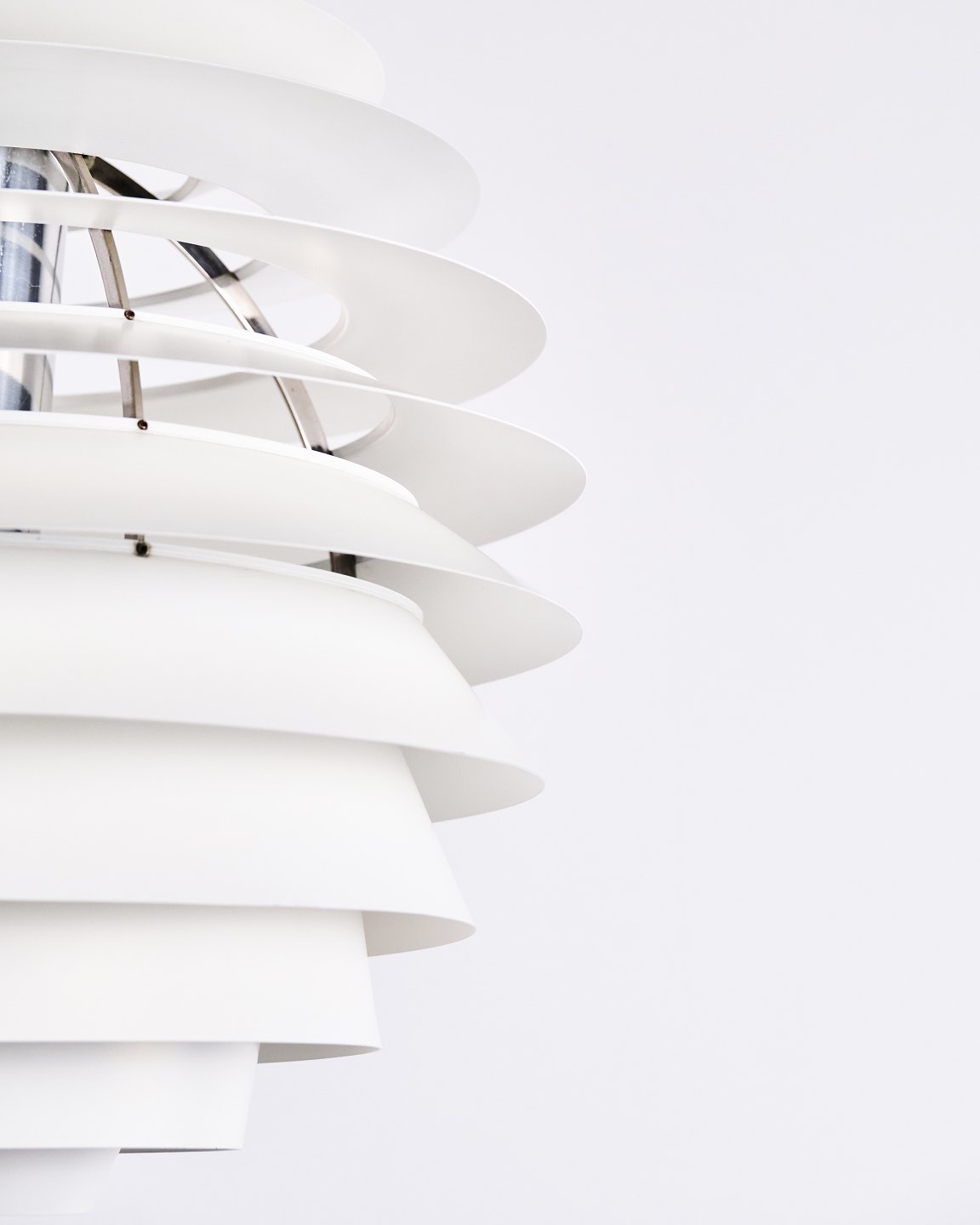 Ikonisk pendel, PH Louvre (tidligere kaldet PH Kugle), designet af Poul Henningsen i 1957 til Adventistkirken i Skodsborg. Lampen er opbygget af 13 lameller monteret på en indre konstruktion, som sikrer et blødt og blændfrit lys. Det kugleformede design skaber en jævn lysfordeling og et skulpturelt udtryk.