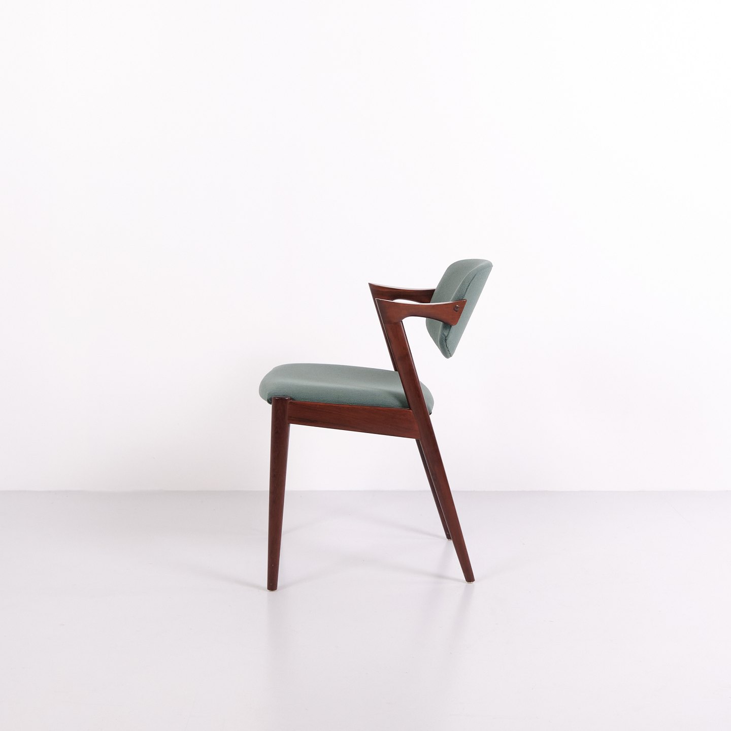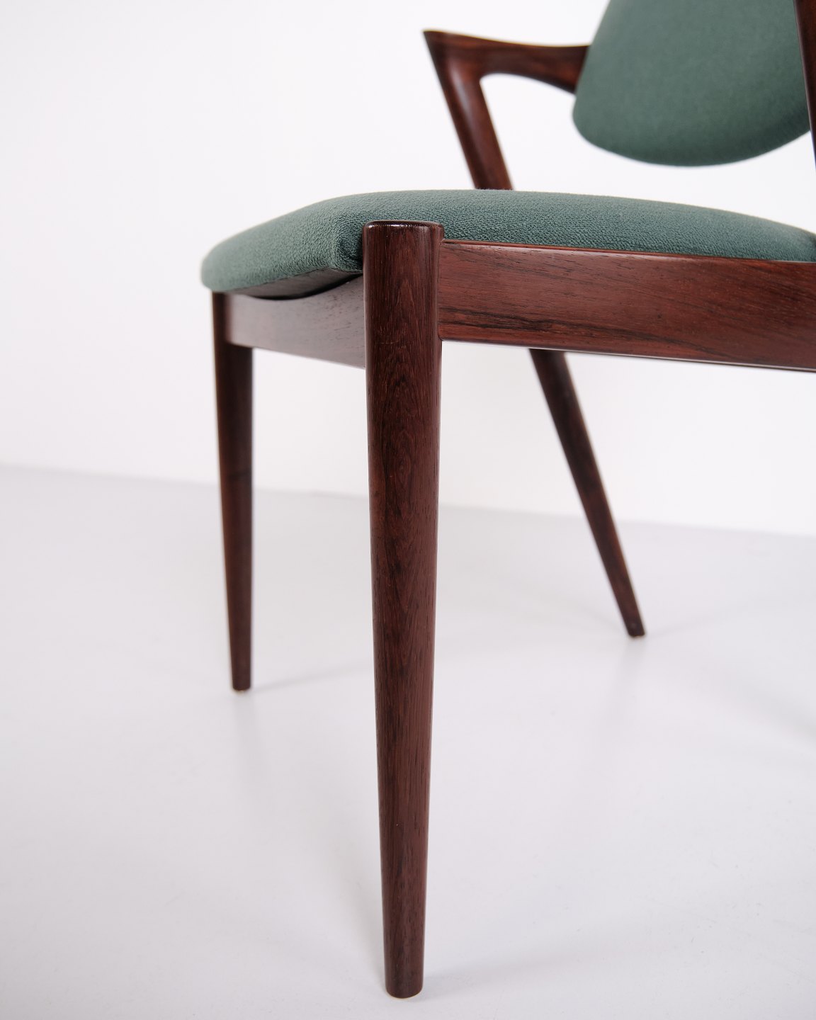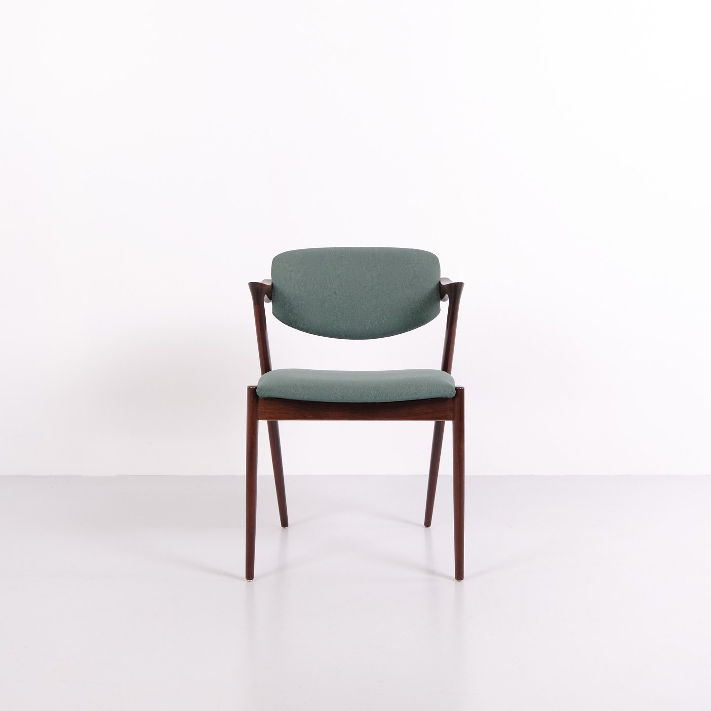 Sæt spisebordsstole, model 42, designet af Kai Kristiansen i 1960’erne. Stolene er udført i palisander og er kendetegnet ved deres elegante proportioner, skulpturelle ryg og karakteristiske danske snedkerdetaljer. Model 42 er et markant eksempel på dansk møbeldesign fra midten af det 20. århundrede.