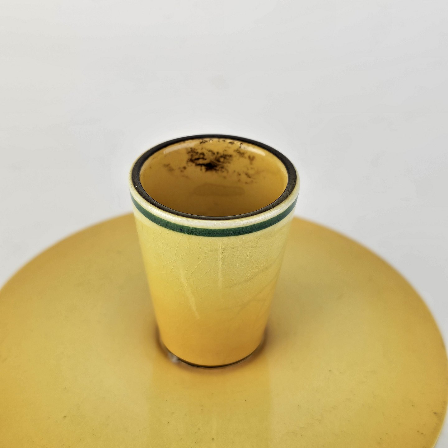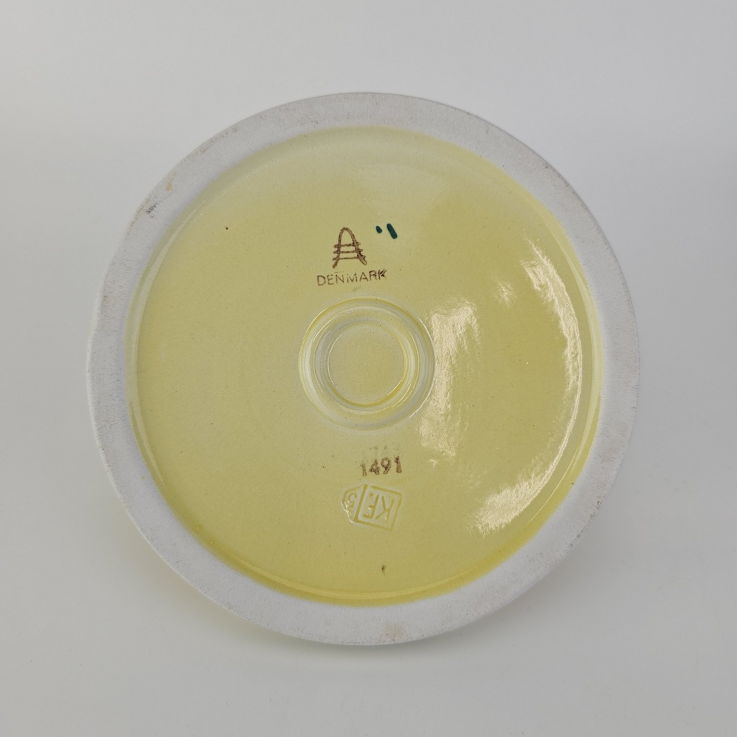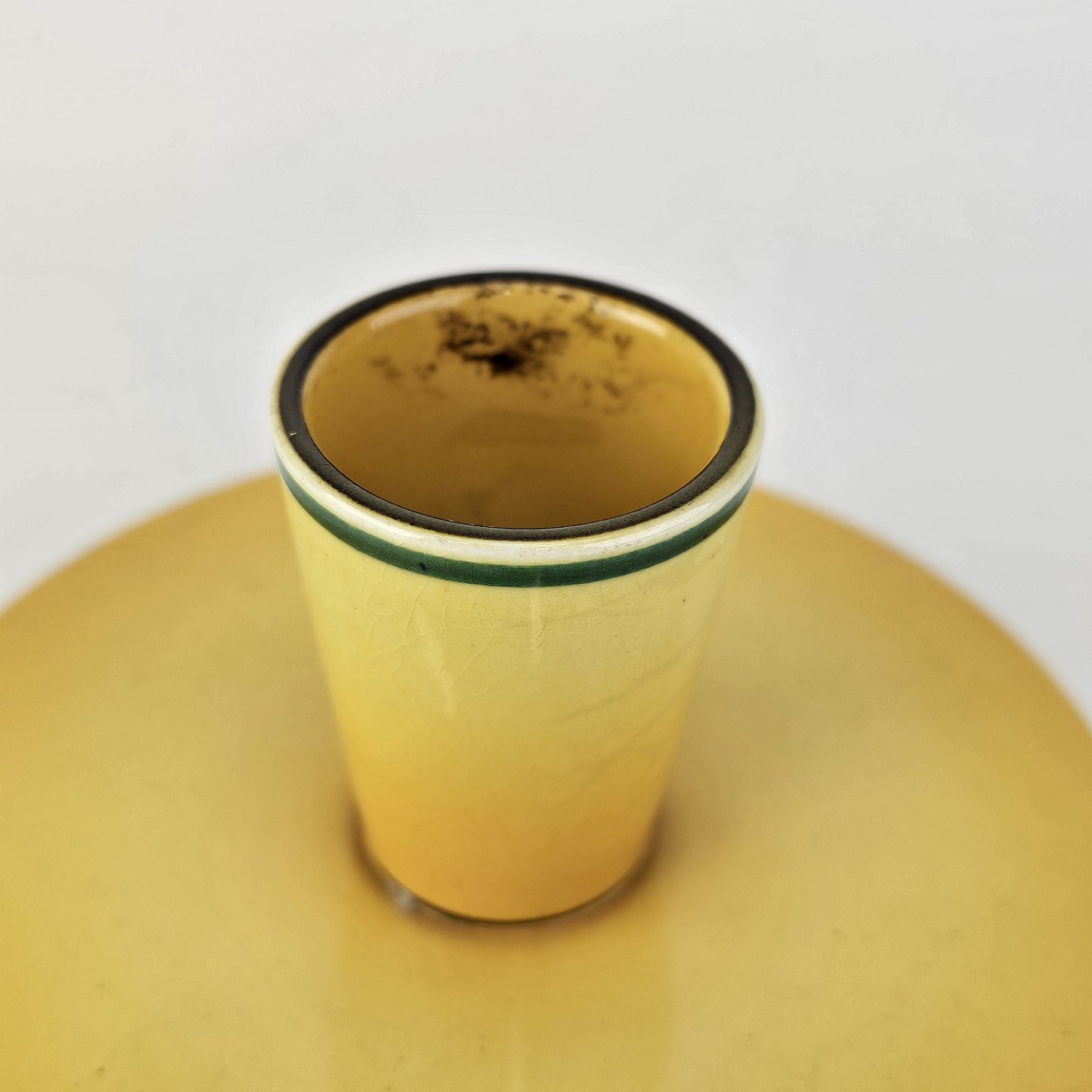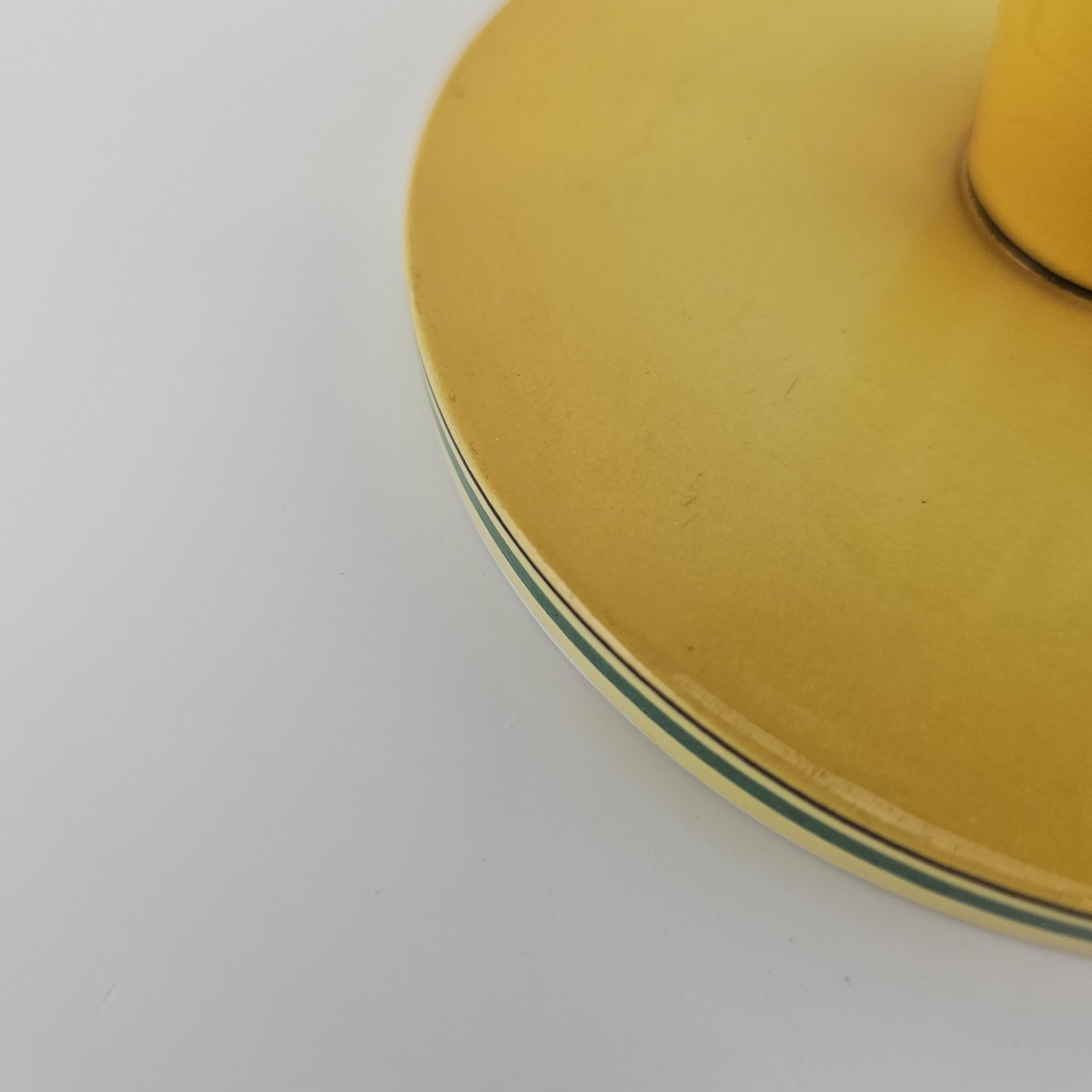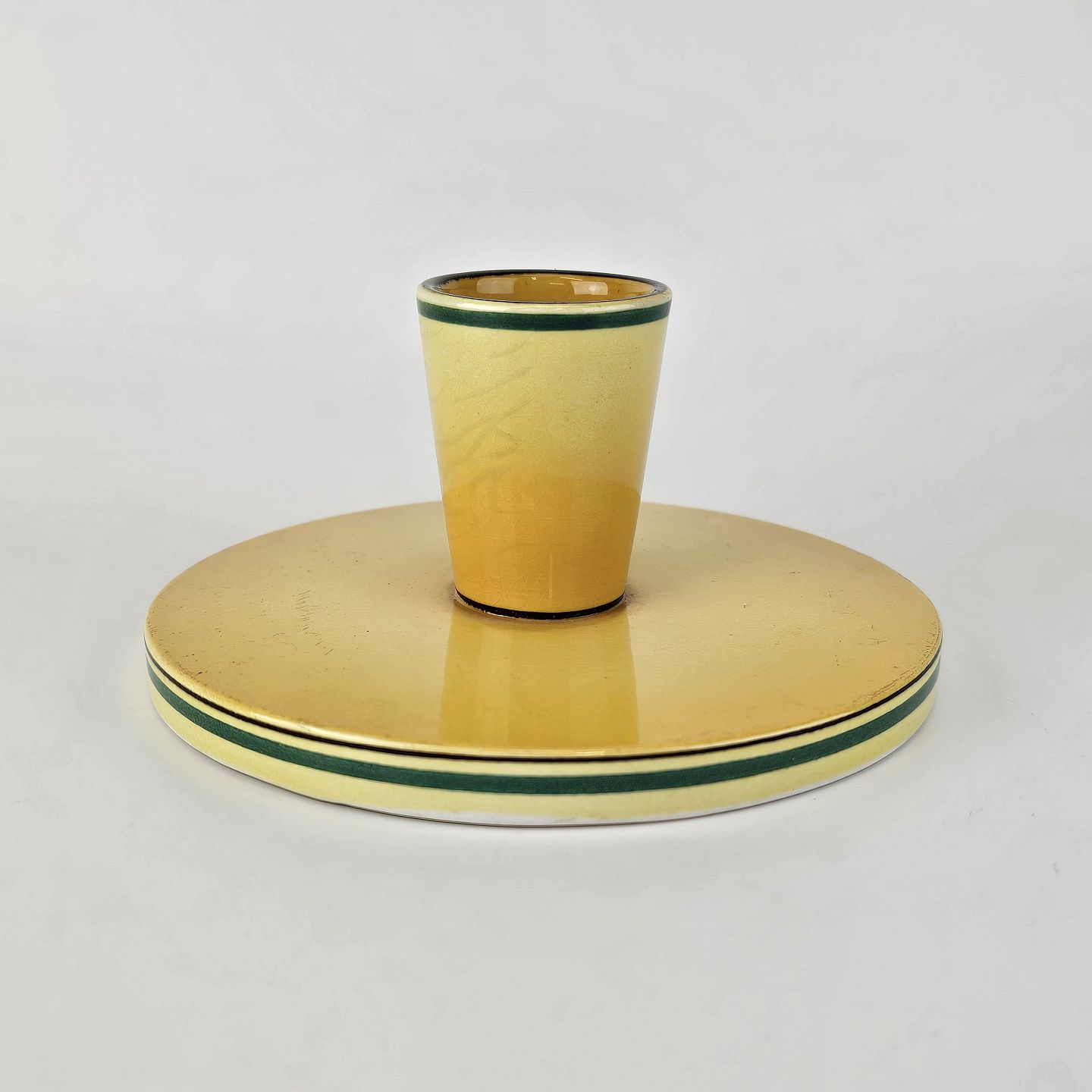 Fajancestel i stelform C med dekoration i gule nuancer med grøn stribe.