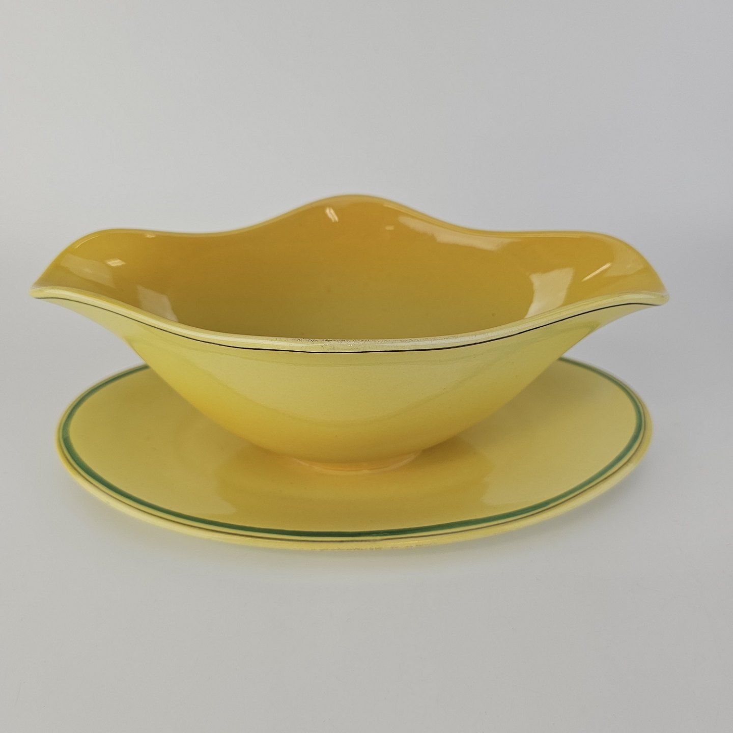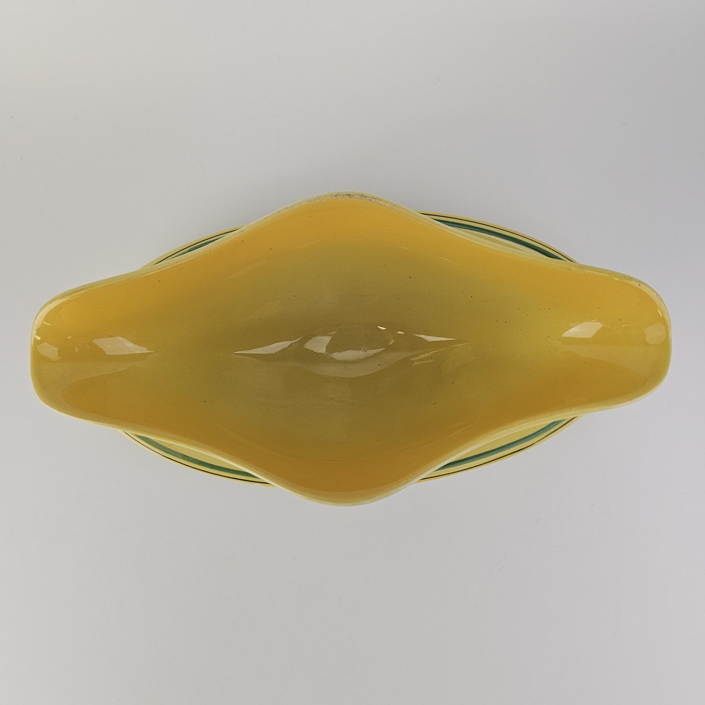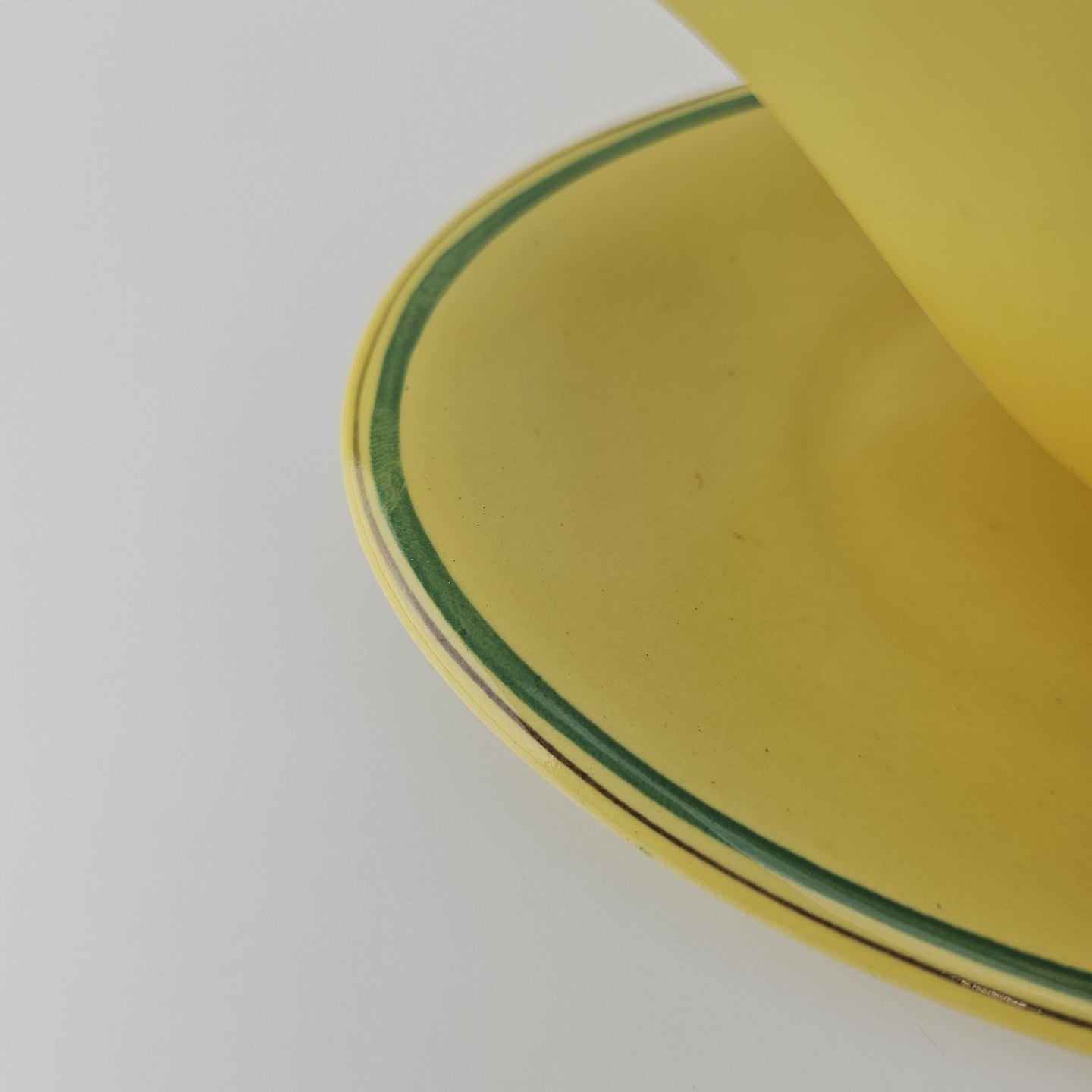 Fajancestel i stelform C med dekoration i gule nuancer med grøn stribe.