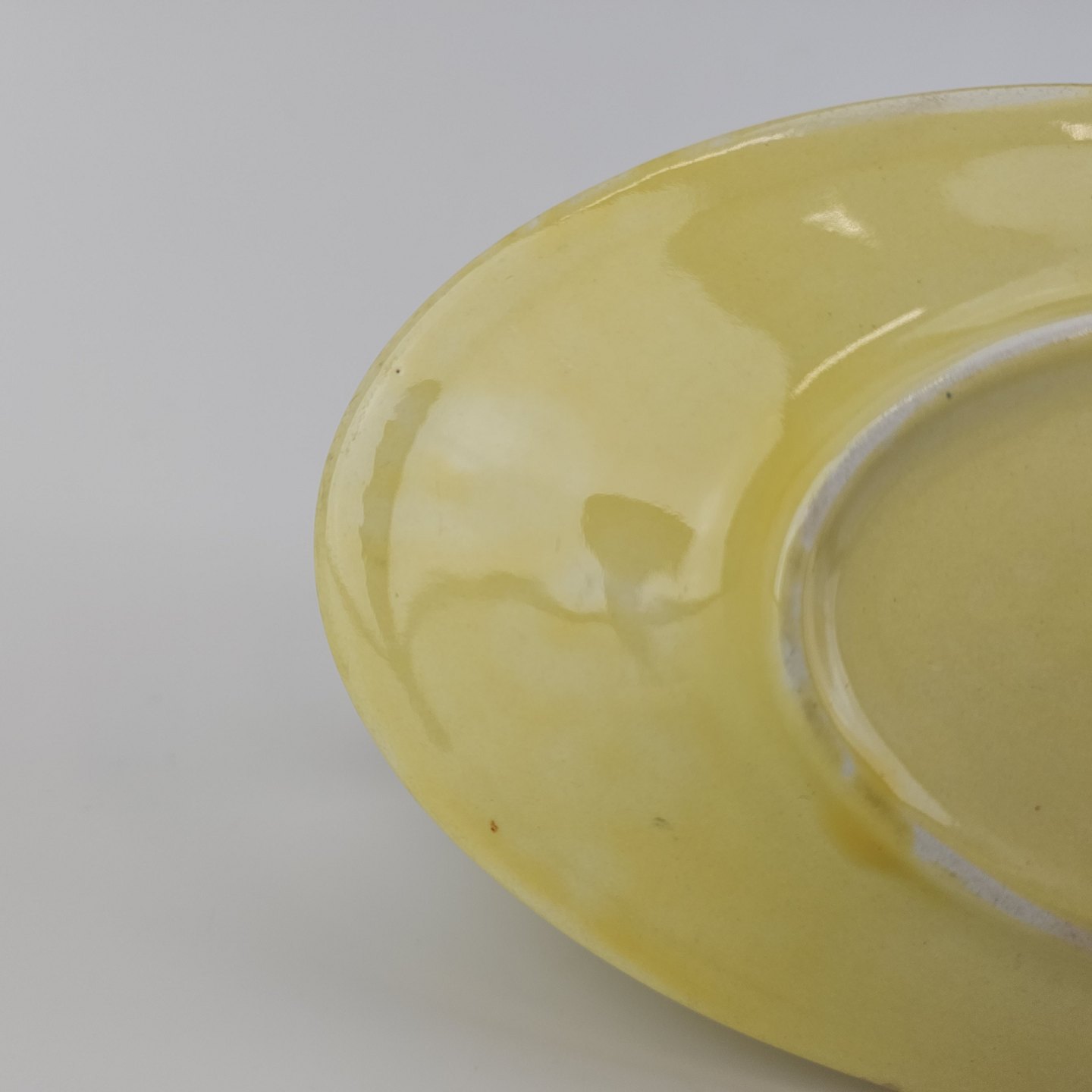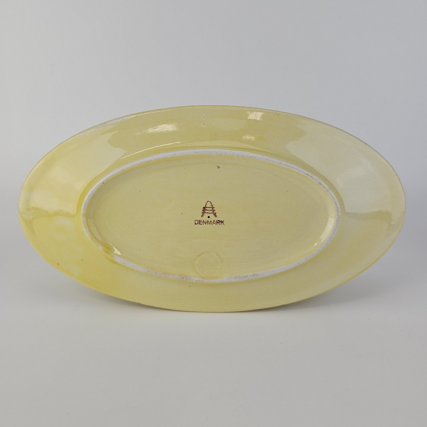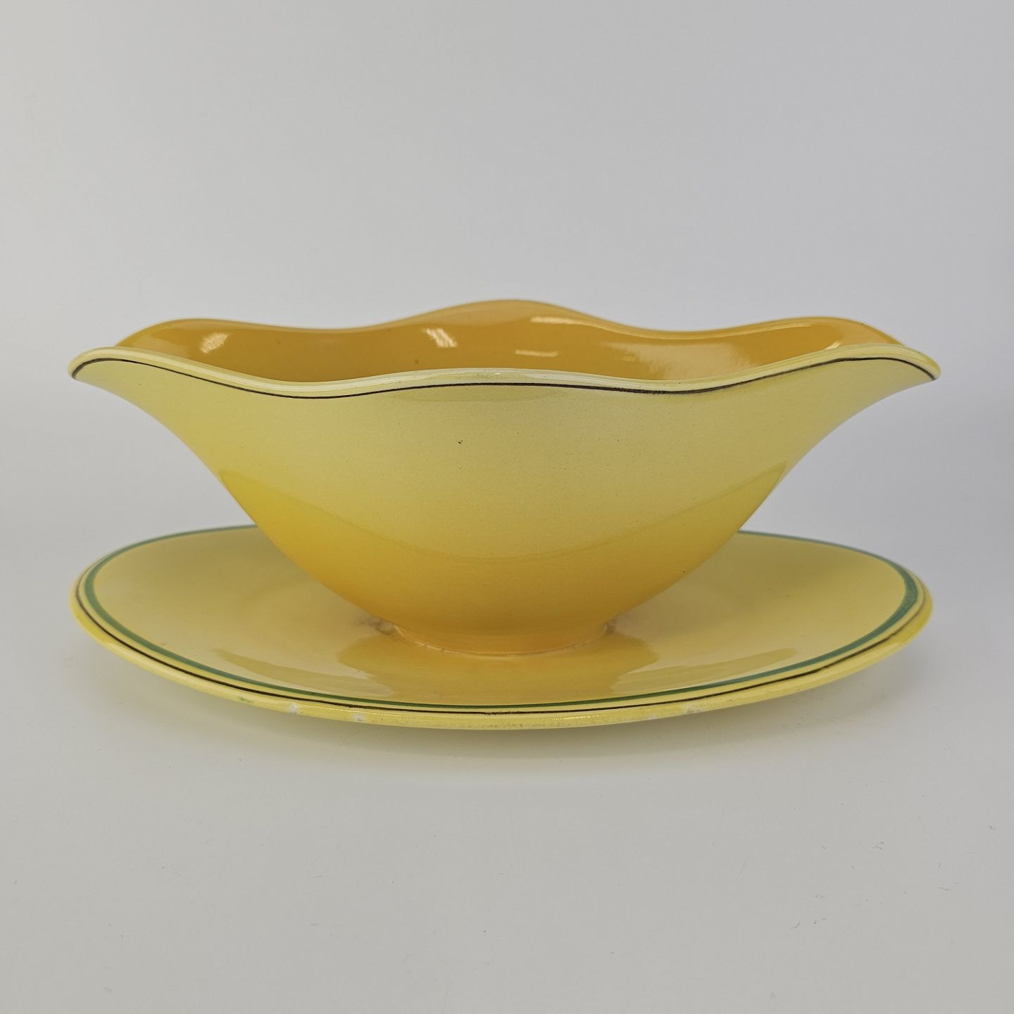 Fajancestel i stelform C med dekoration i gule nuancer med grøn stribe.