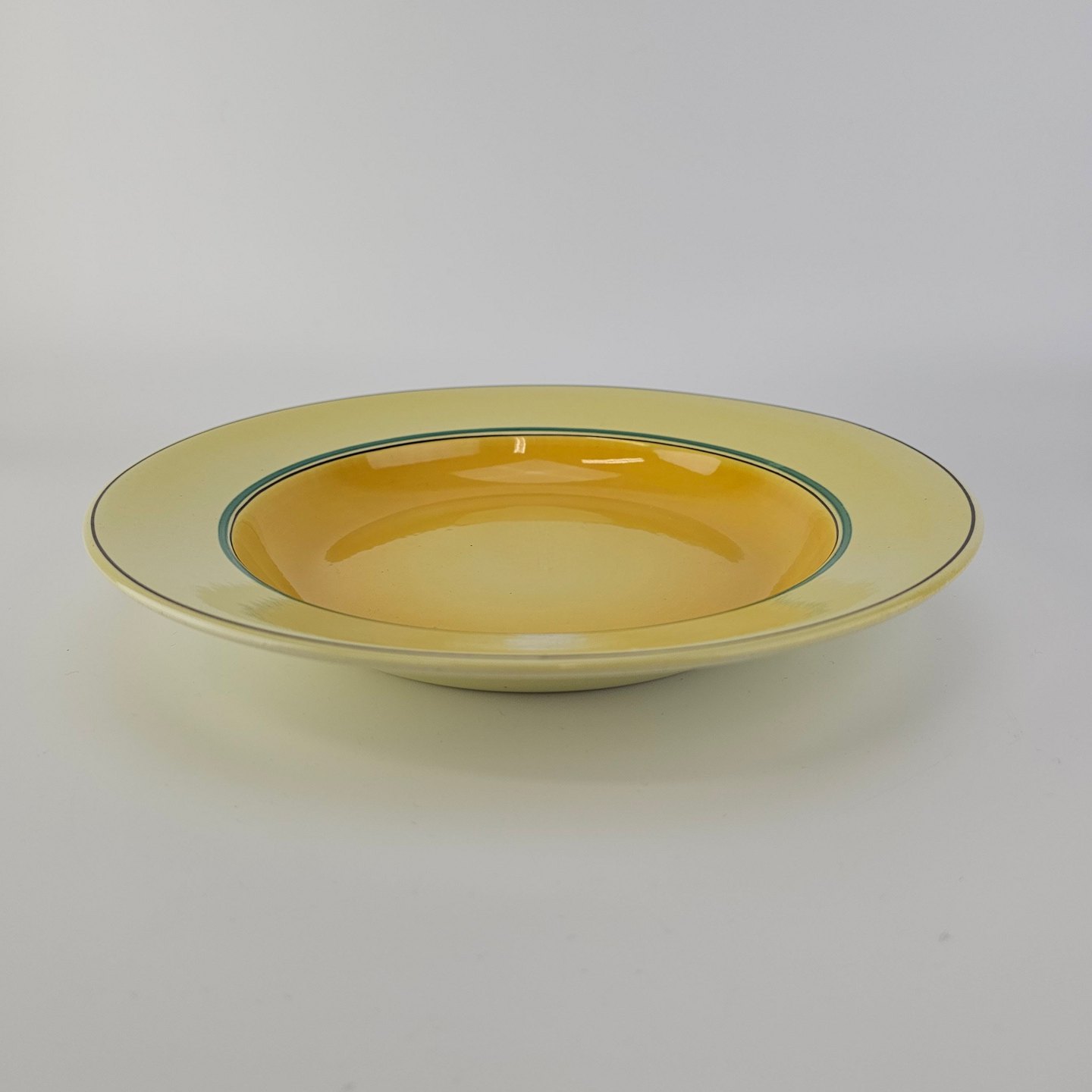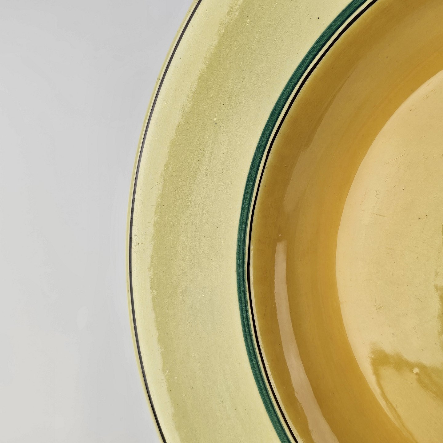 Fajancestel i stelform C med dekoration i gule nuancer med grøn stribe.