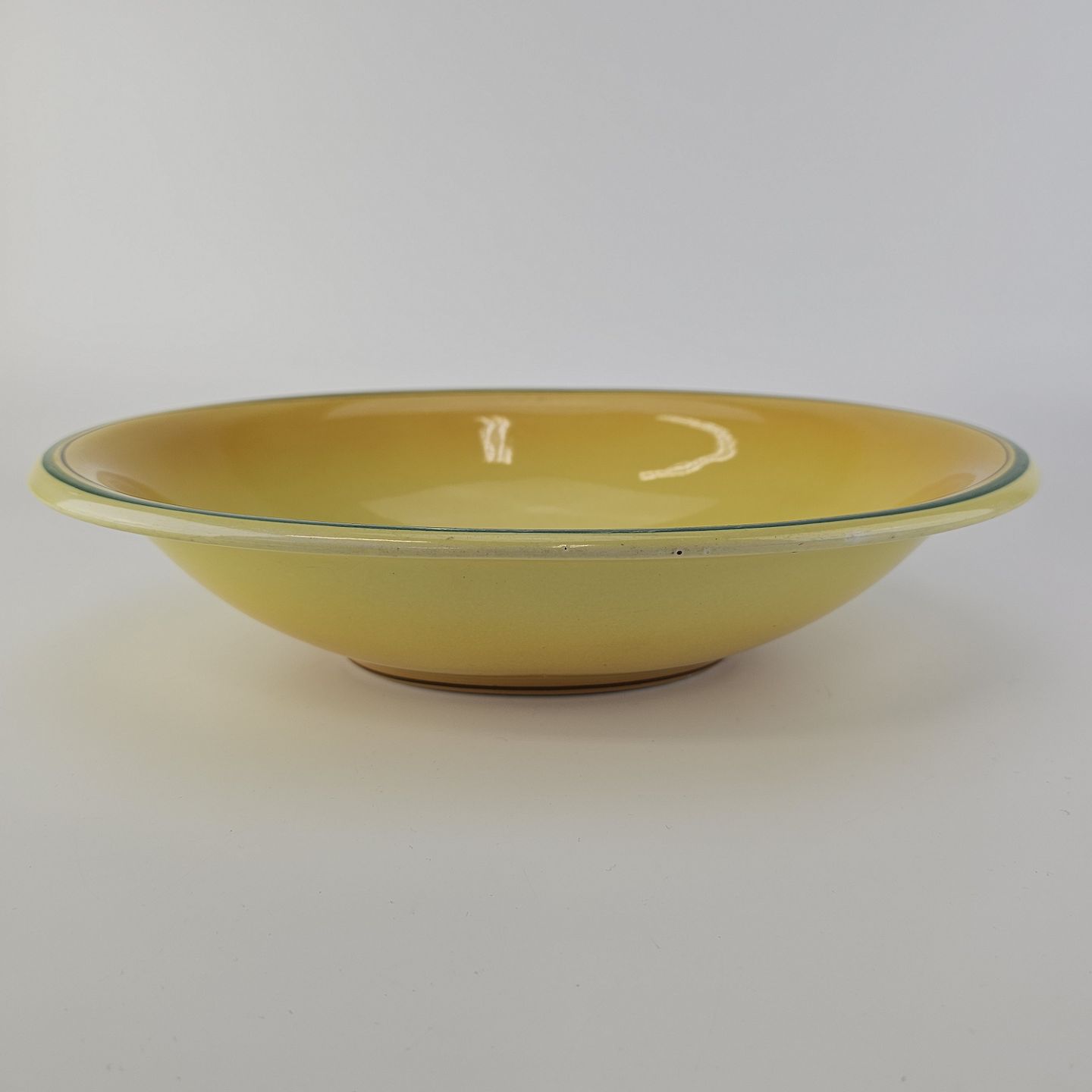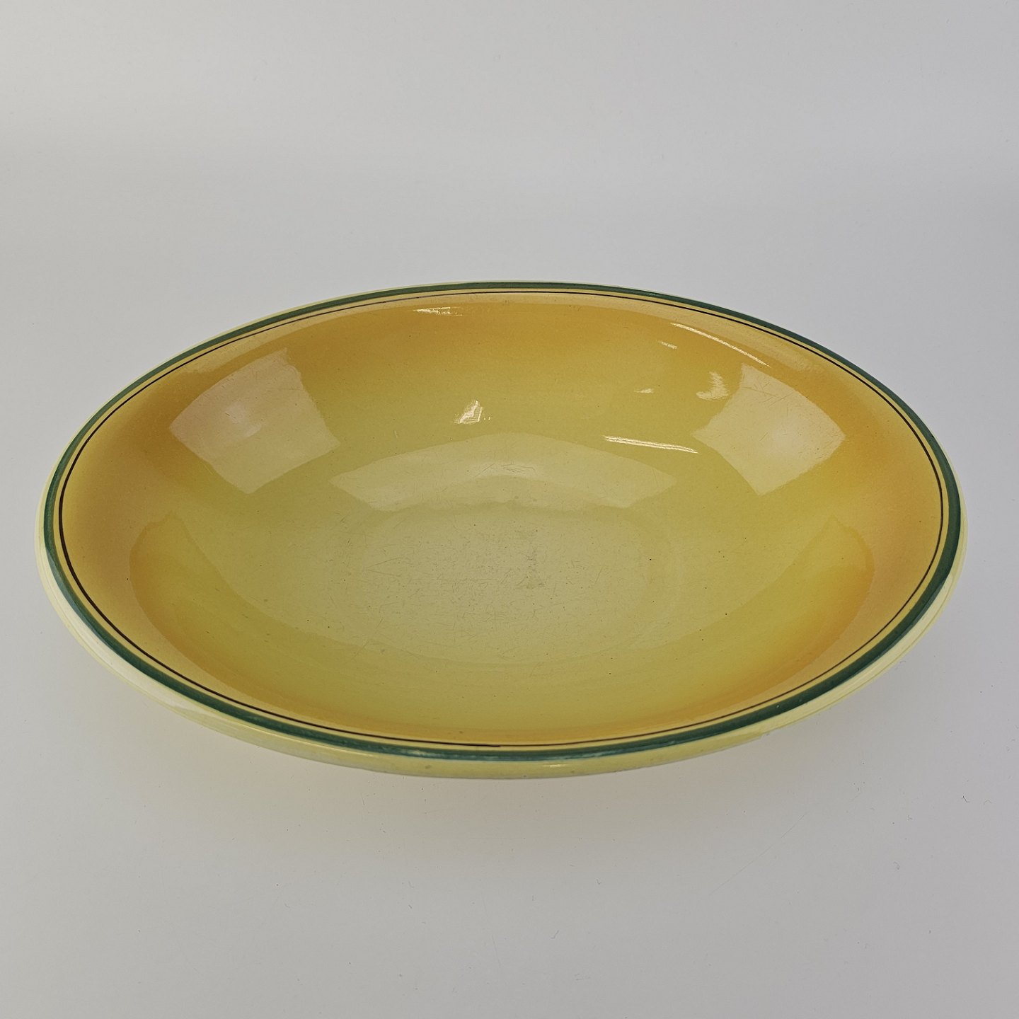 Fajancestel i stelform C med dekoration i gule nuancer med grøn stribe.