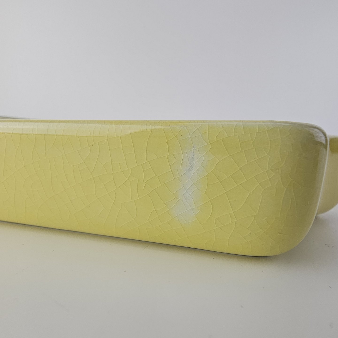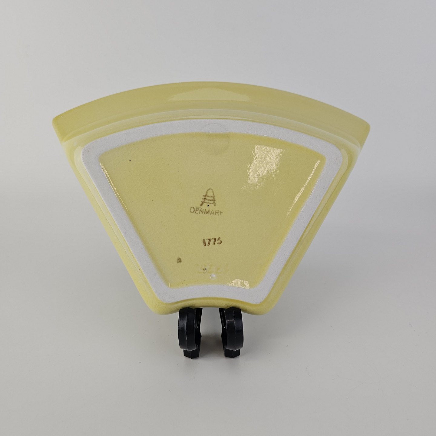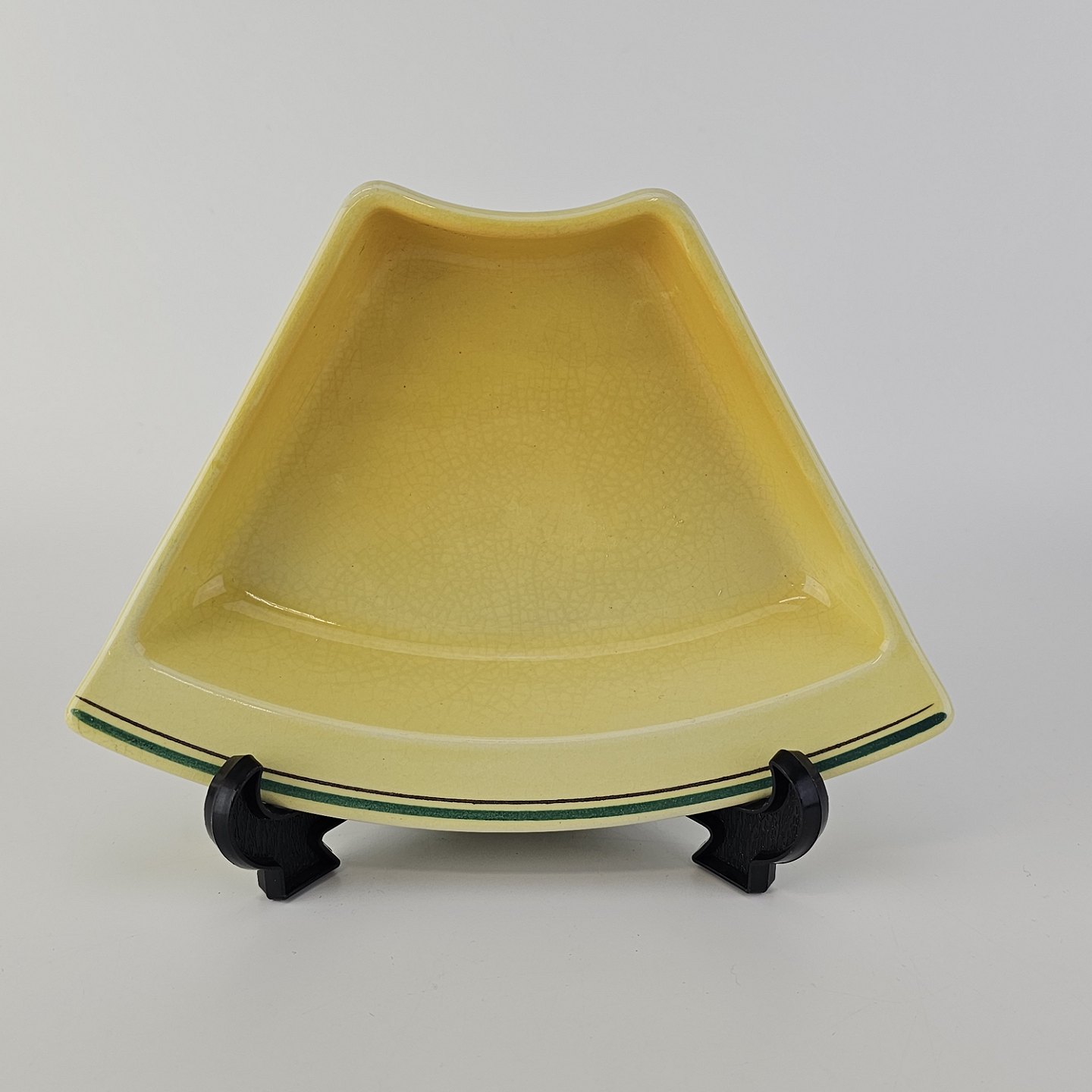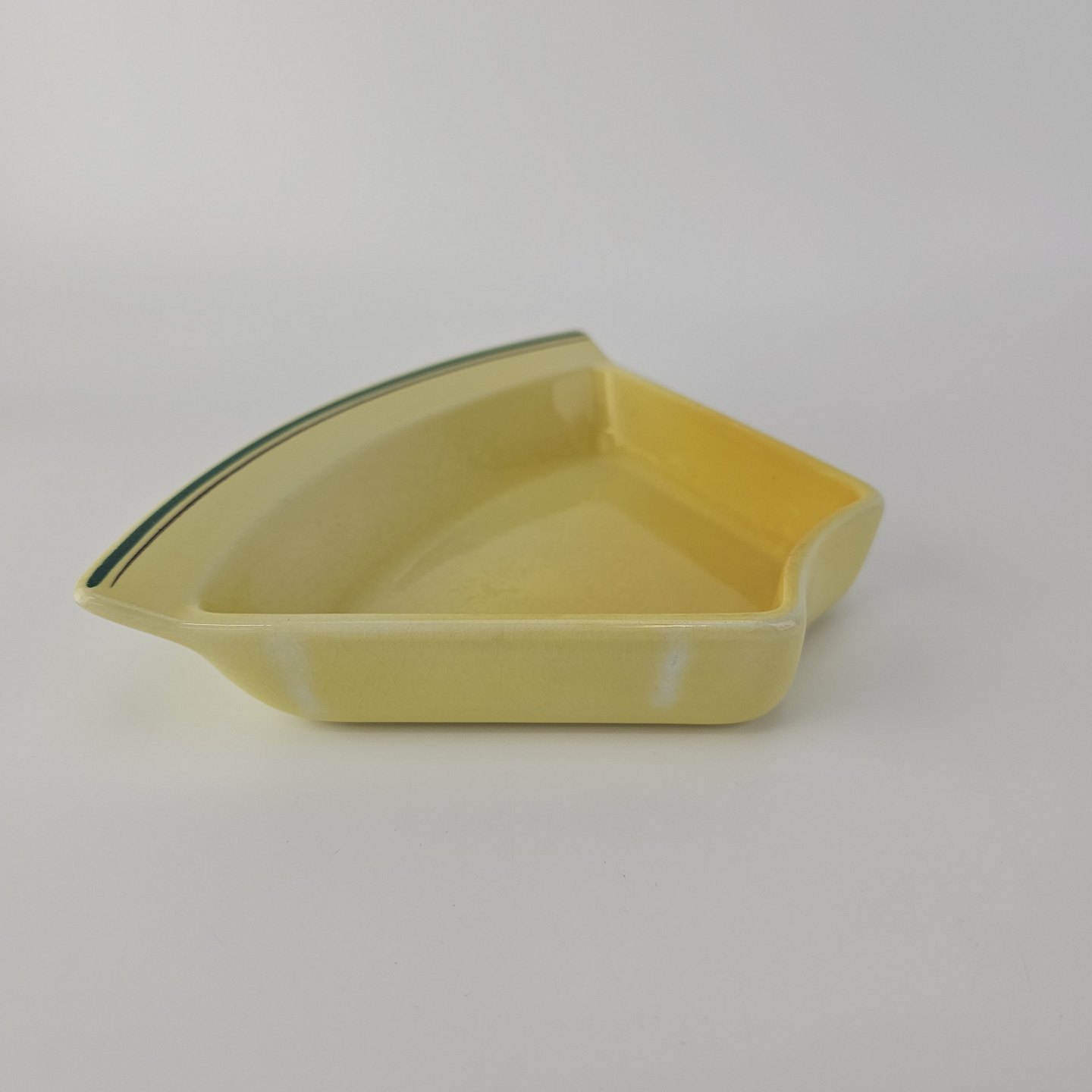 Fajancestel i stelform C med dekoration i gule nuancer med grøn stribe.