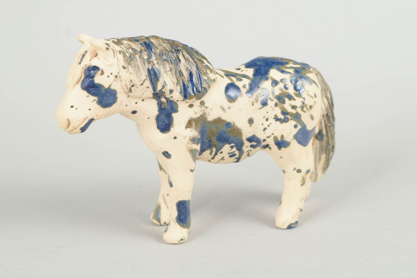Unik keramisk figur forestillende en pony udført i stentøj med lys glasur dekoreret med blå og brunlige nuancer i et spontant, malerisk mønster. Figuren er modelleret med naturlig kropsholdning og detaljeret manke og hoved, hvilket giver et levende og karakterfuldt udtryk. Usigneret unika fra 1970’erne.
