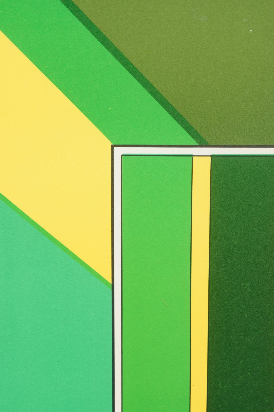 Geometrisk og optisk komposition udført som farvelitografi i klare grønne og gule felter med centralt rektangulært motiv.