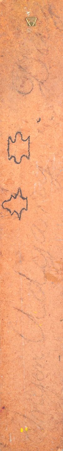 Smalt, vertikalt figurativt motiv udført i olie på træplade. Kompositionen viser en stiliseret menneskefigur i afdæmpede grønne, røde og grå toner med en drømmende og let ekspressiv karakter. Den aflange form giver værket et næsten ikonagtigt udtryk, hvor figuren fremstår centralt placeret i en enkel, malerisk baggrund.