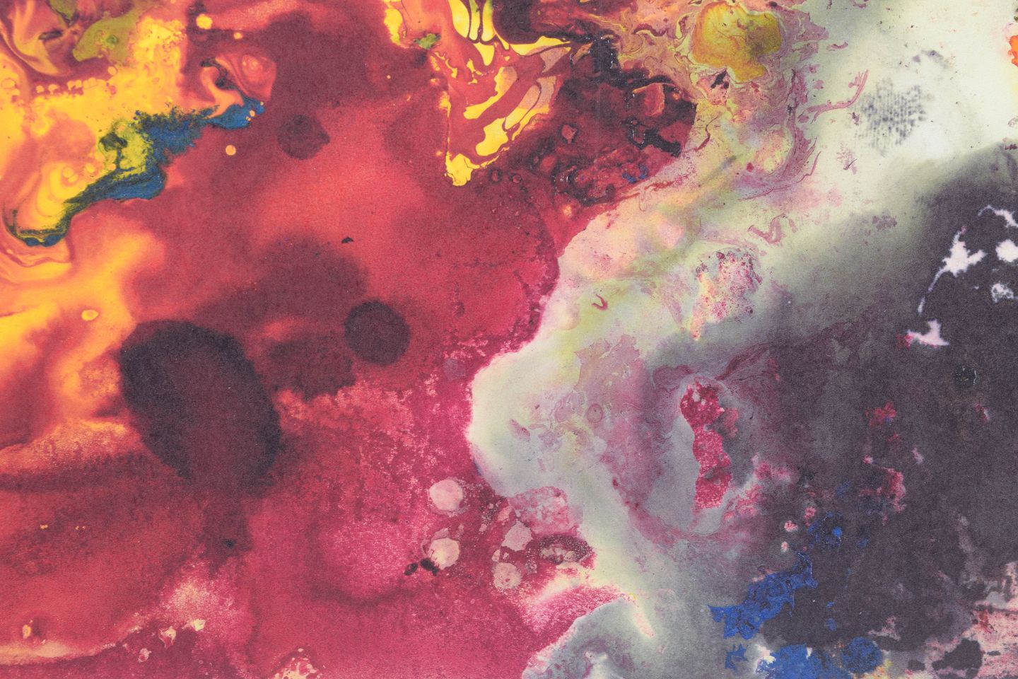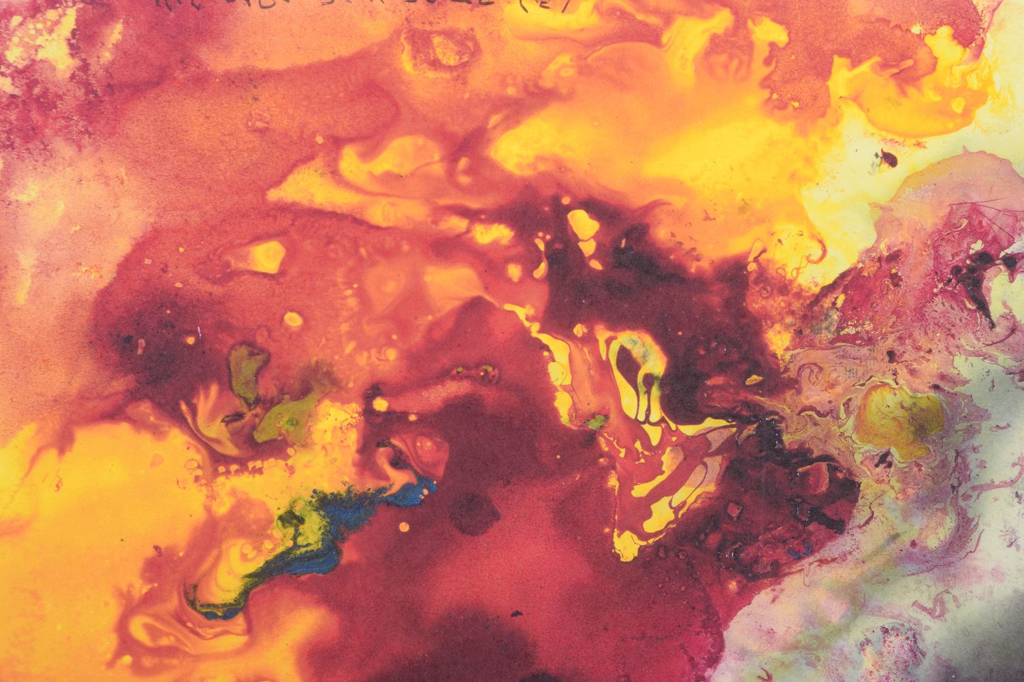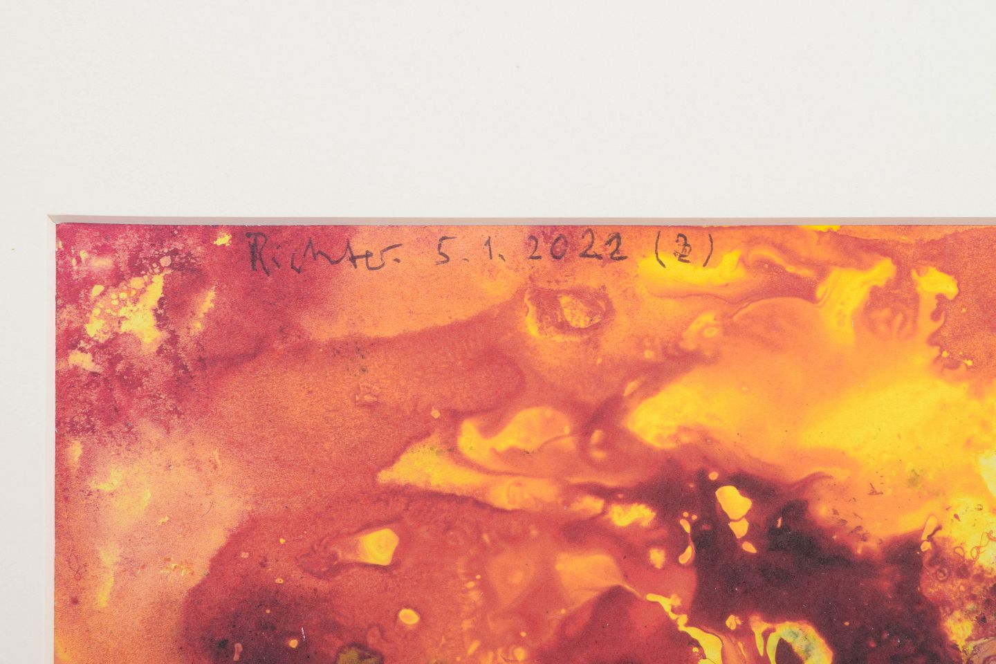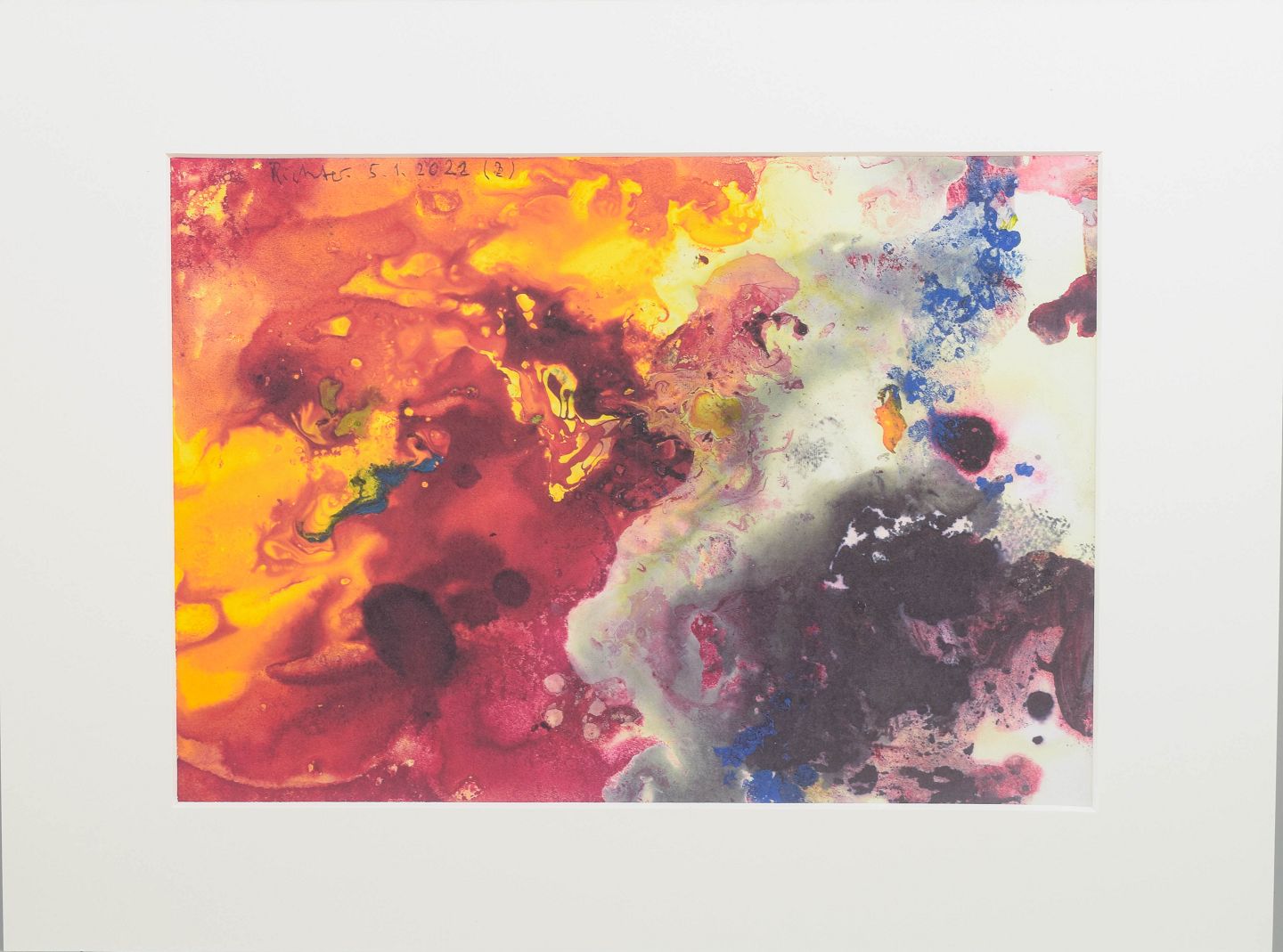 Abstrakt komposition udført som farvetryk med dynamiske farvefelter i intense røde, gule, blå og mørke toner. Motivet har en flydende og eksplosiv karakter med organiske former og transparente lag. Signeret i blyant, dateret 2022.