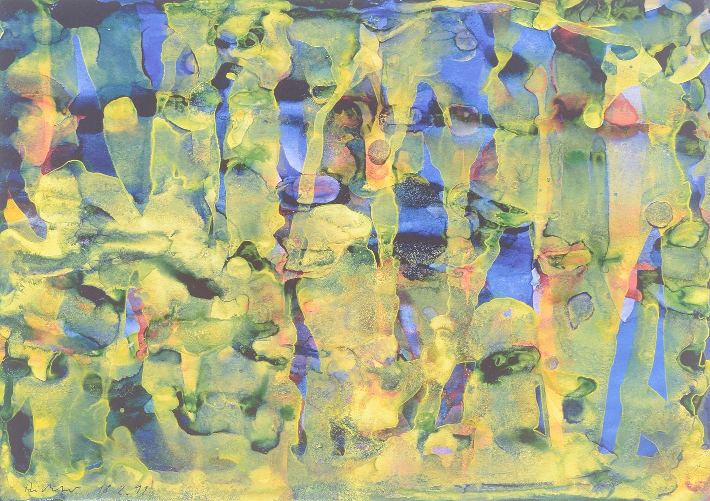 Abstrakt komposition udført som farvetryk med flydende, organiske former i lag af grønne, blå, gule og violette toner. Motivet har en karakteristisk opløst struktur med vertikale spor og transparente farvefelter. Signeret i trykket og dateret 1991.