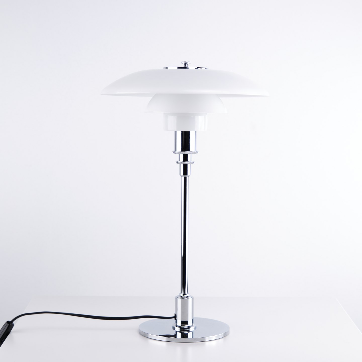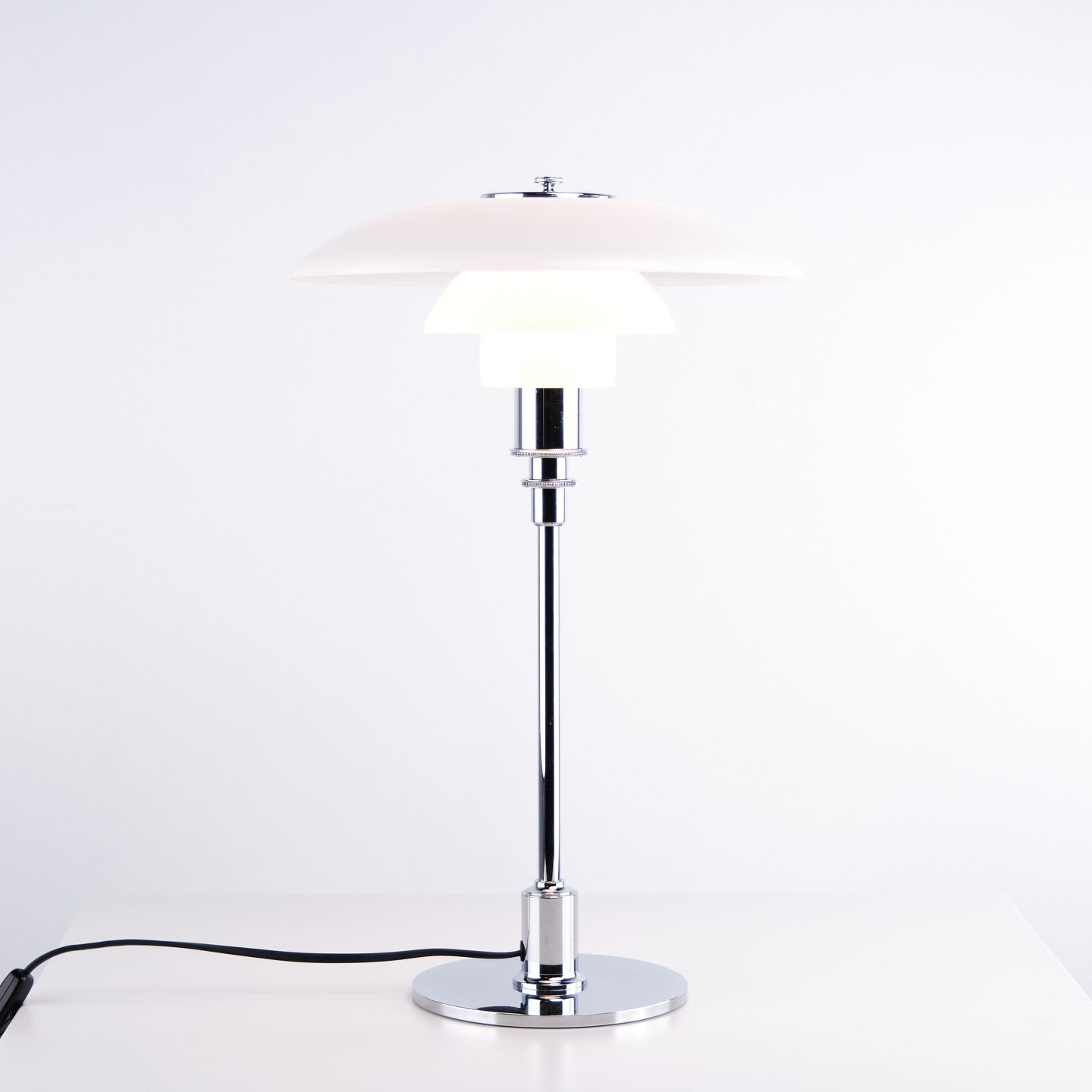 PH 3/2 bordlampe designet af Poul Henningsen og fremstillet af Louis Poulsen. Lampen er udført med skærme i hvidt opalglas, som sikrer et blødt og blændfrit lys. Det ikoniske treskærmssystem er udviklet for optimal lysfordeling og er et centralt element i Henningsens designfilosofi.
